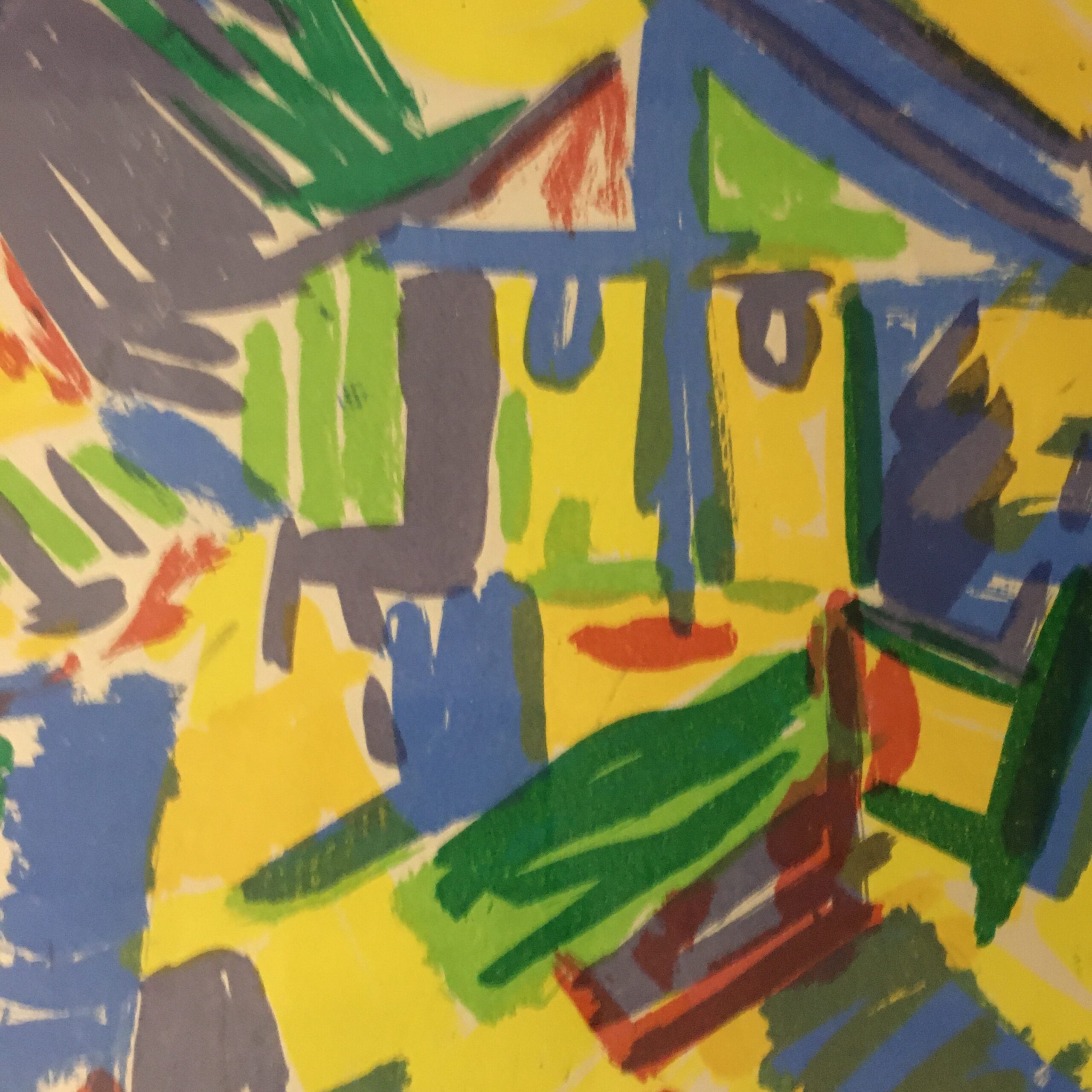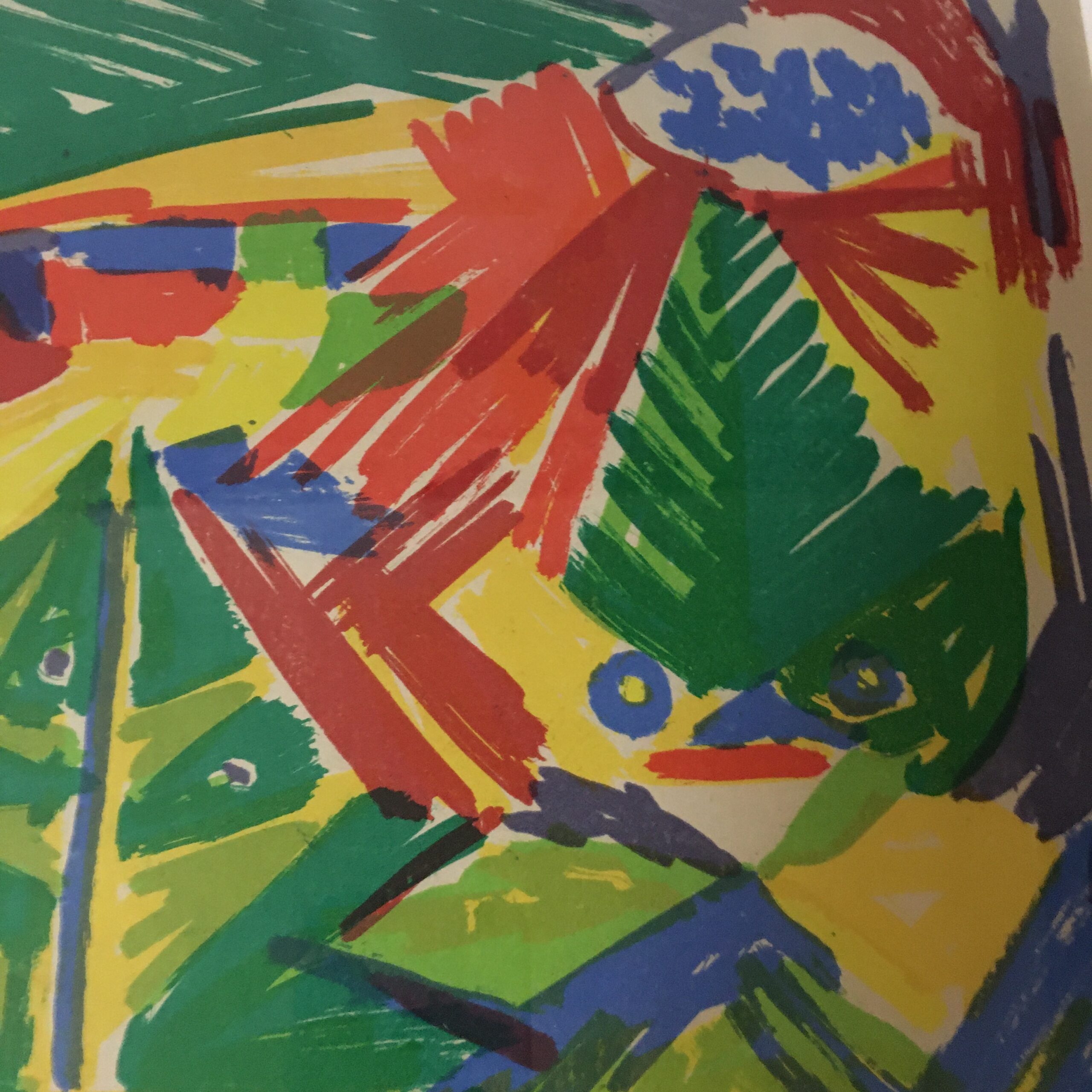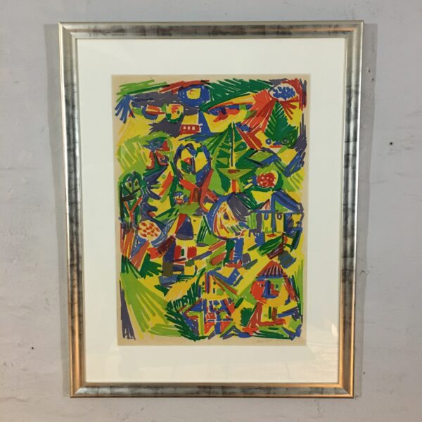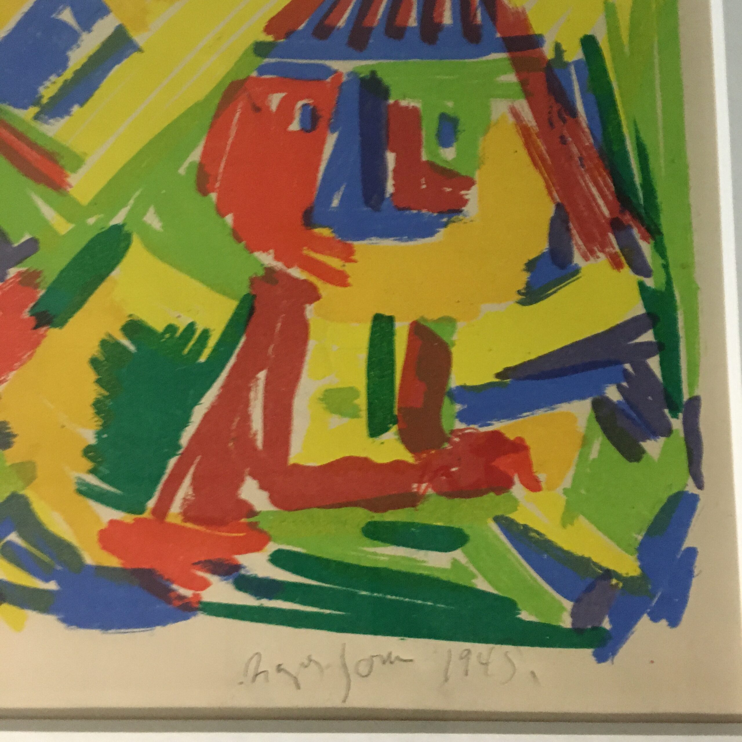 Hovedværk, signeret Jorn i 1945. Det er et originalt farvelitografi, trykt hos J C Sørensen & Co i København. Et ud af 40 prøvetryk. Lys mål 60 x 42 cm og rammemål 84 x 64 cm. Det er indrammet med passe partout og en sølvfarvet træramme.