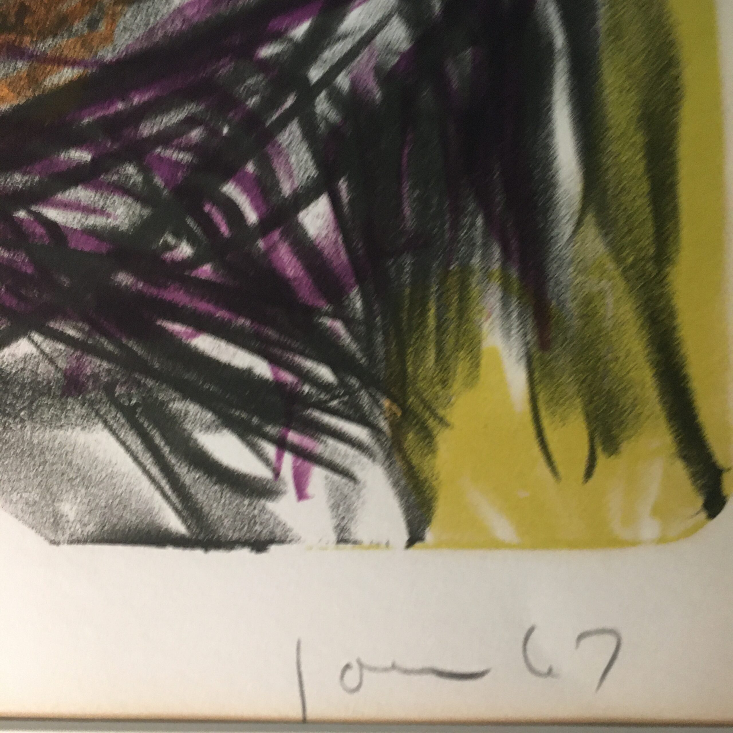 Hovedværk, signeret Jorn i 1967. Det er et originalt farvelitografi. Lysmål 73 x 54 cm og rammemål 95 x 72 cm. Det er indrammet med passe partout og en ny lys træramme. Og værket er med refleksfri ”museumsglas”.