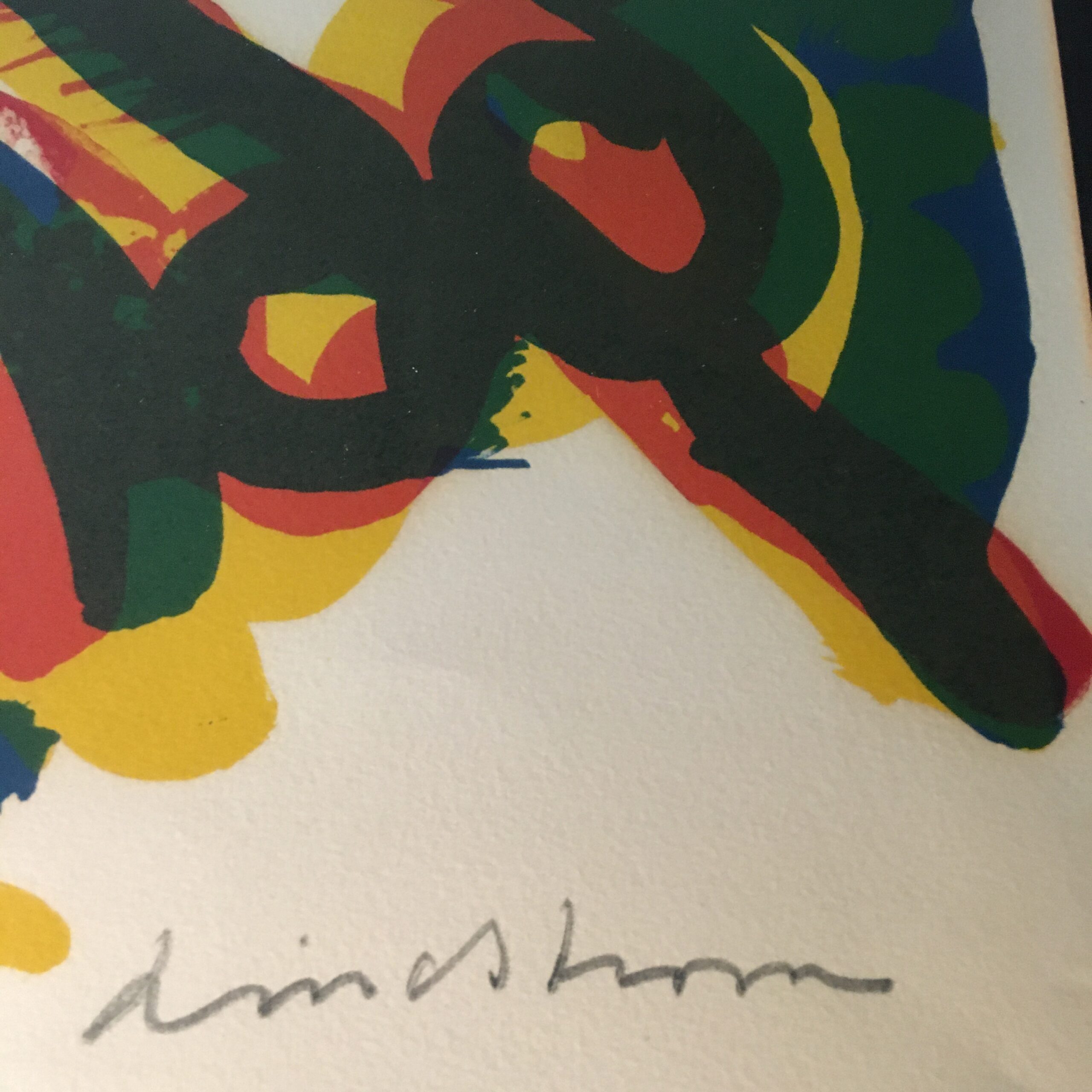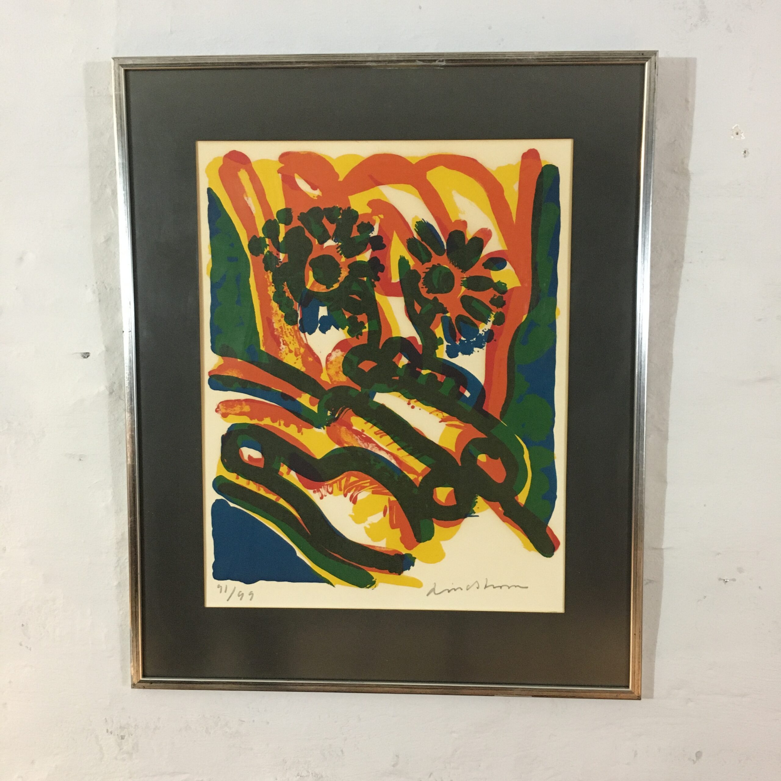 ”Blomster komposition” er en fin, lille repræsentation for Lindstrøms kunst. Originallitografiet er nummereret 91 af 99 og signeret Lindstrøm. Lys mål 48 x 38 cm og rammemål 65 x 53 cm. Det er indrammet med passe partout og en sølvfarvet træramme.