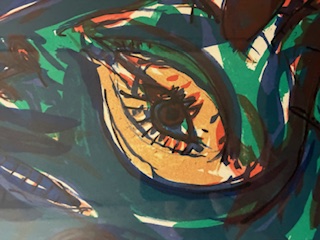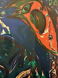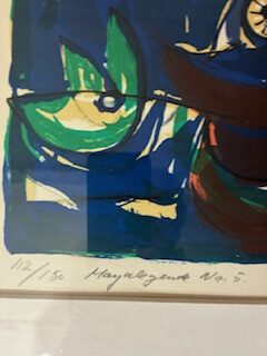 ”Maya legende nr. 5” skabt i 1977”. 55 x 75 cm. Det er nr. 112 af 150.og dermed trykt i et begrænset oplag. Lys mål 54 x 75 cm og rammemål 69 x 90 cm. Det er med passepartout og en gedigen sølvfarvet træramme.