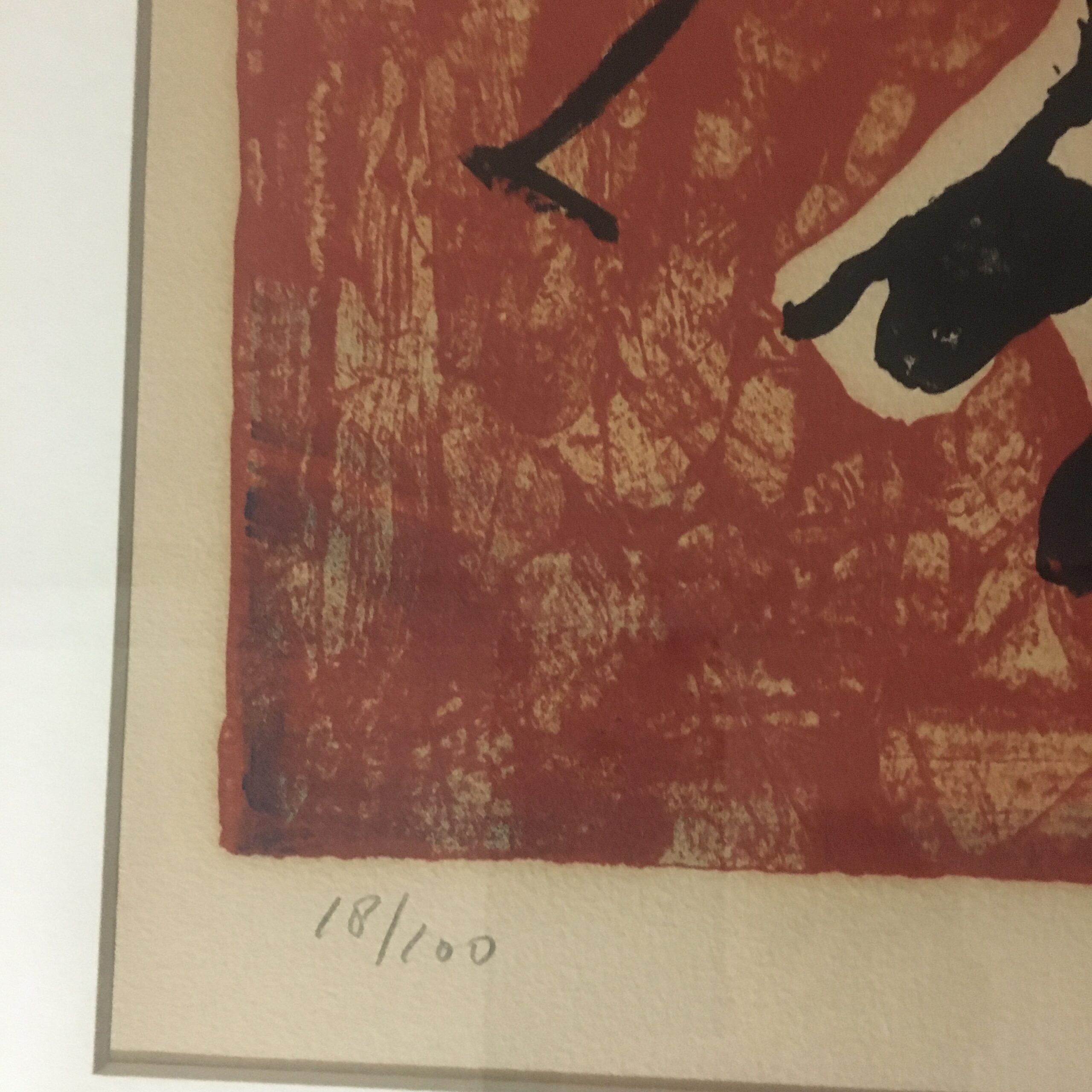 ”Pour Jorn” er et originalt litografisk farvetryk signeret af Constant. Nr. 18 af 100 tryk. Lys mål 60 x 53 cm og med rammemål 78 x 68 cm. Med Passe par tout og en egetræsramme. Det er trykt hos Clot, Bramsen og Georges i Paris