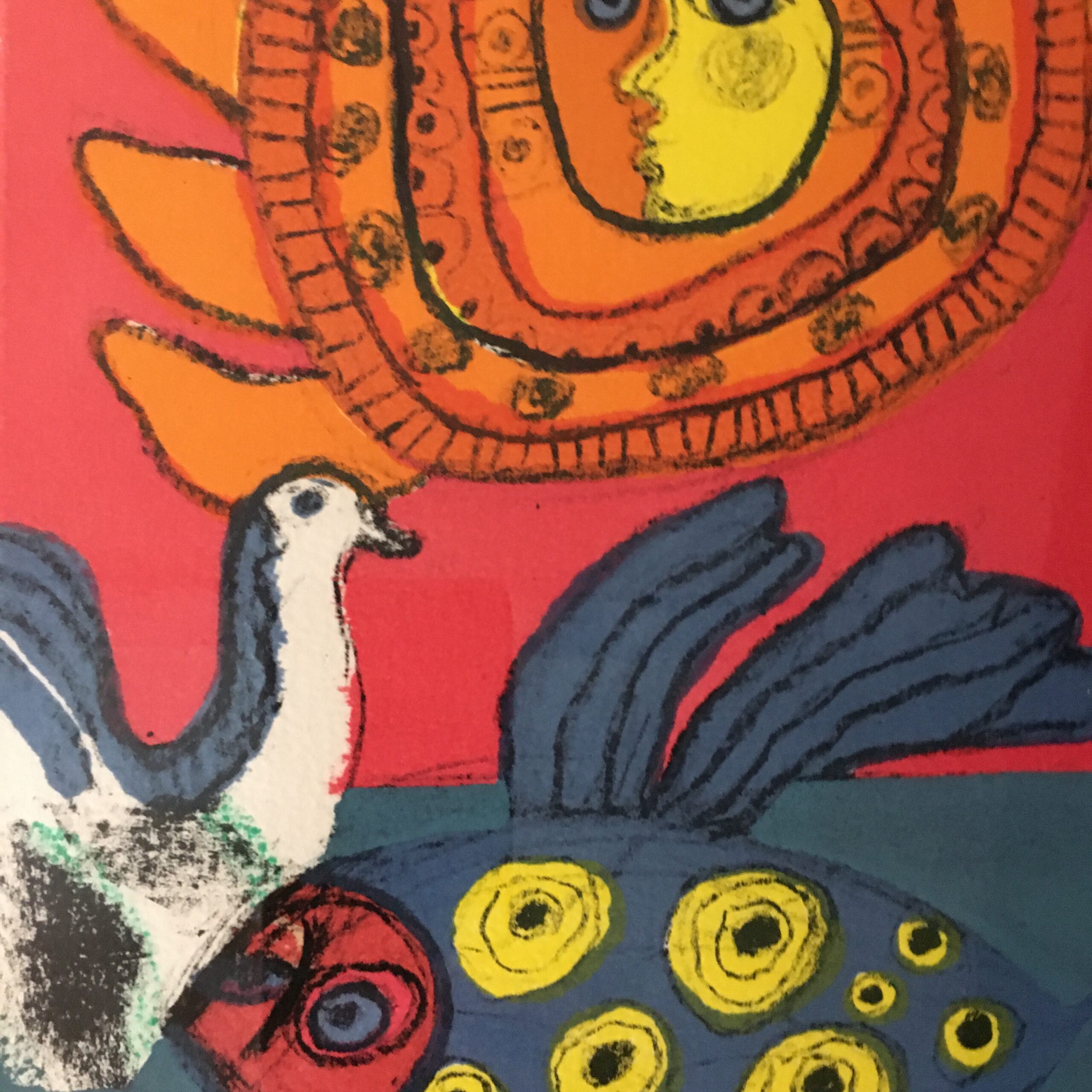 Solen, fuglen og kvinden er et originalt litografi skabt i 1984, med lys mål 40 x 29 cm og rammemål 46 x 35