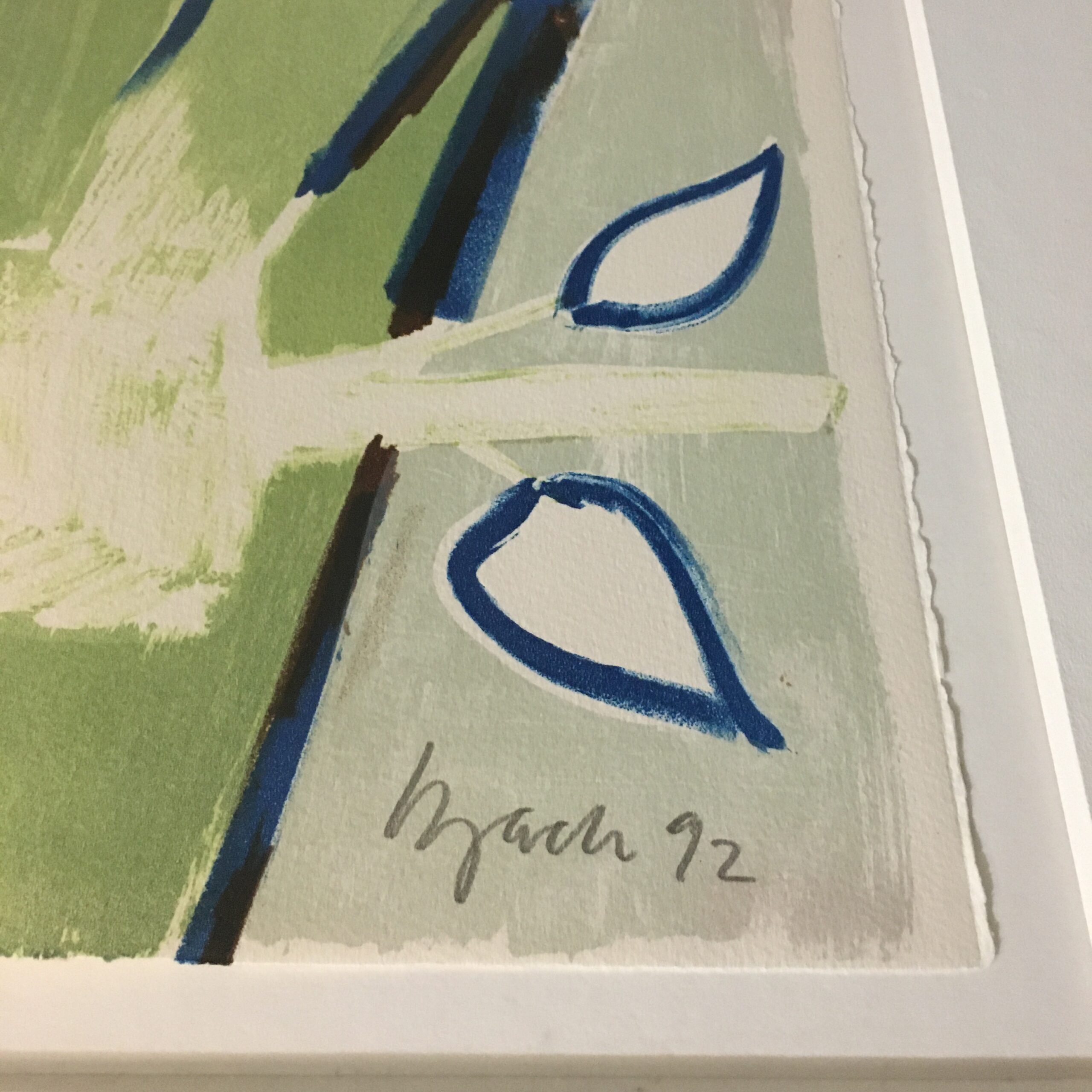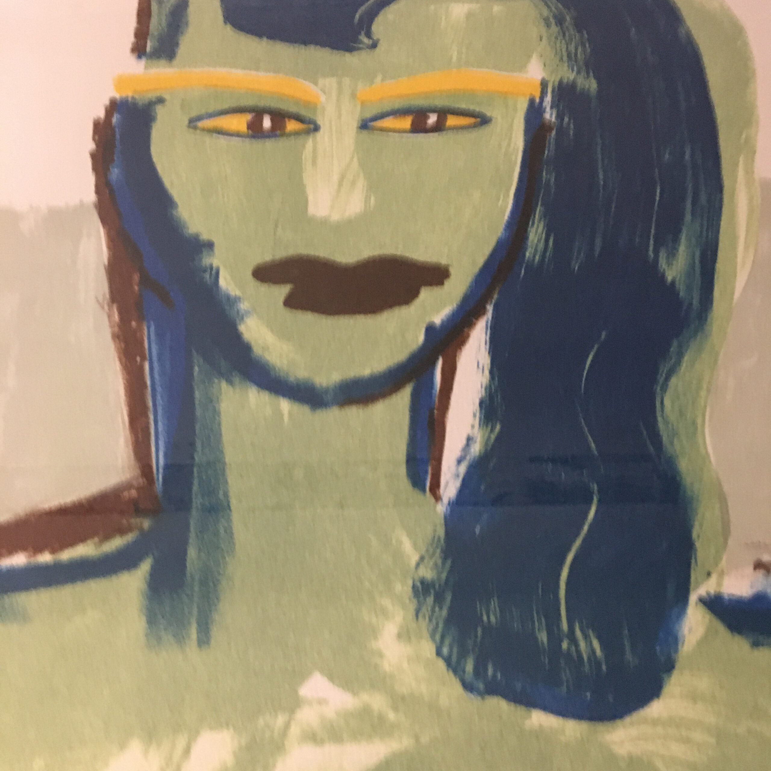 ”Frau with strong eyes” er et original litografisk tryk, skabt i samarbejde med “U M Grafik” i dag “Edition Copenhagen in 1992. Det er signeret af Bach og nummer 29 af kun 60 værker. Lys mål 76 cm gange 56 cm. Og rammemål er110 x 85 cm. Det er indrammet med passe par tout og en sølvfarvet gedigen træramme.