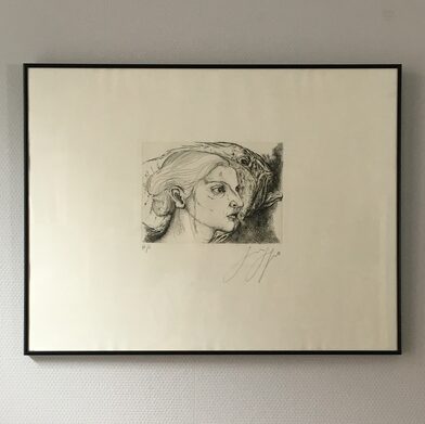 ” Woman in the Halibut”, sign. Gynter Grass, trykt i 1983, nr. XII/L. Koldnålsradering i sort/hvid. Lysmål 17 x 24 cm. Rammemål 50 x 64 cm. Meget sjældent udbudt.