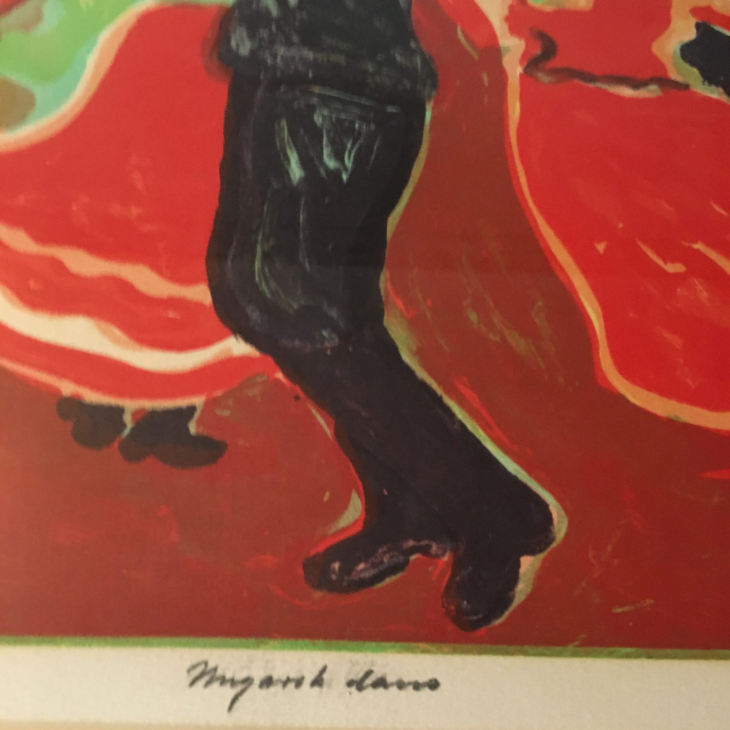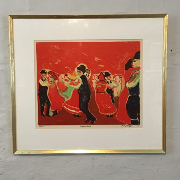 Ungarsk dans er et smukt og stærkt eksempel på Vogt Steffensens kunst. Det er et originalt litografi, trykt i 1980, som nr. 42 ud af 100 tryk. Lysmål 43 x 52 cm og rammemål 66 x 74 cm. Det med passe partout og med en smuk, gylden træramme.