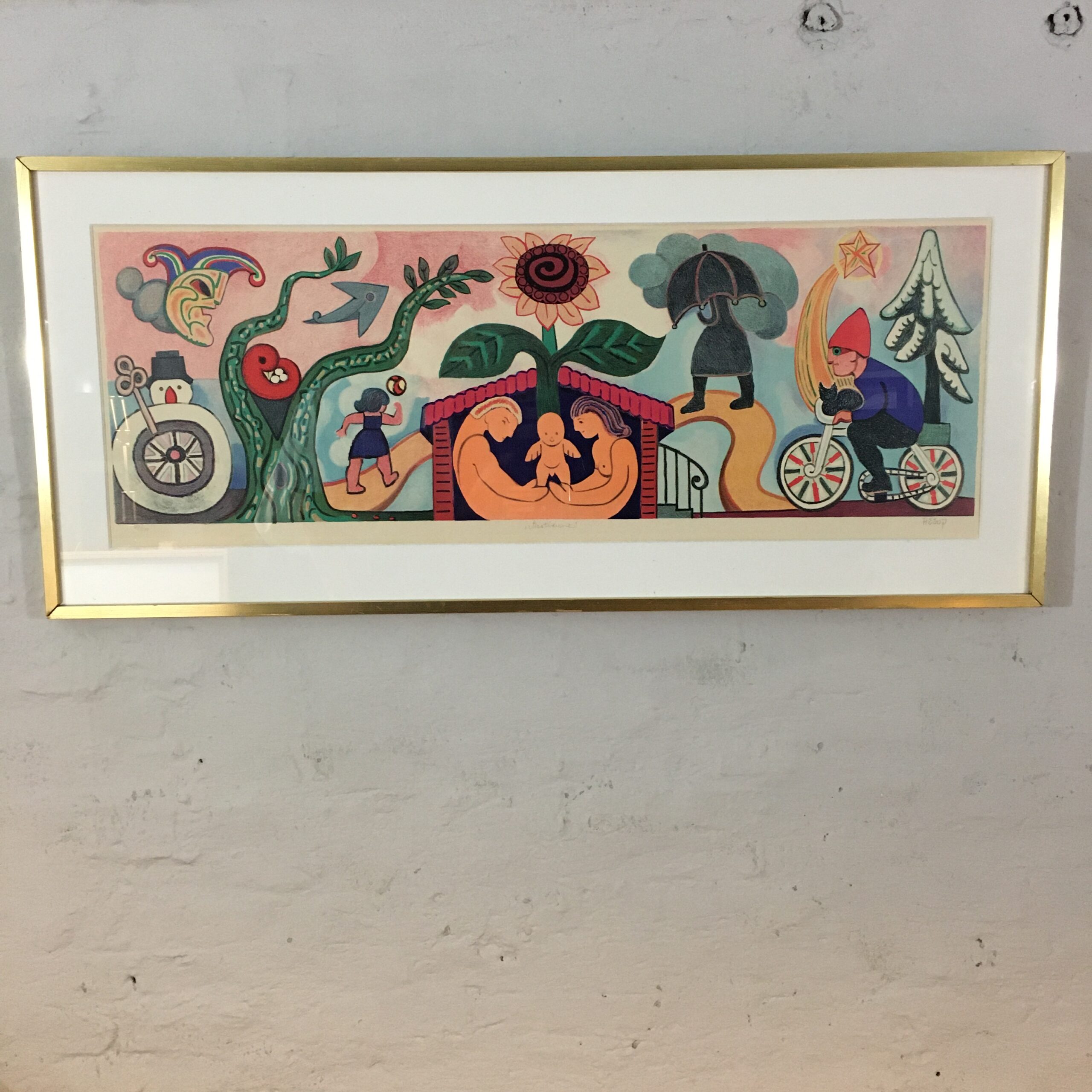 ”Årstiderne” er et af Heerups fineste og mest elskede originale litografier. Det er sign. Heerup. Trykt i 1980 som nr. 49 af 500 ex. Lys mål 36 x 100 cm. Rammemål 49 x 118 cm. Det er med pas partout og en gylden træramme.