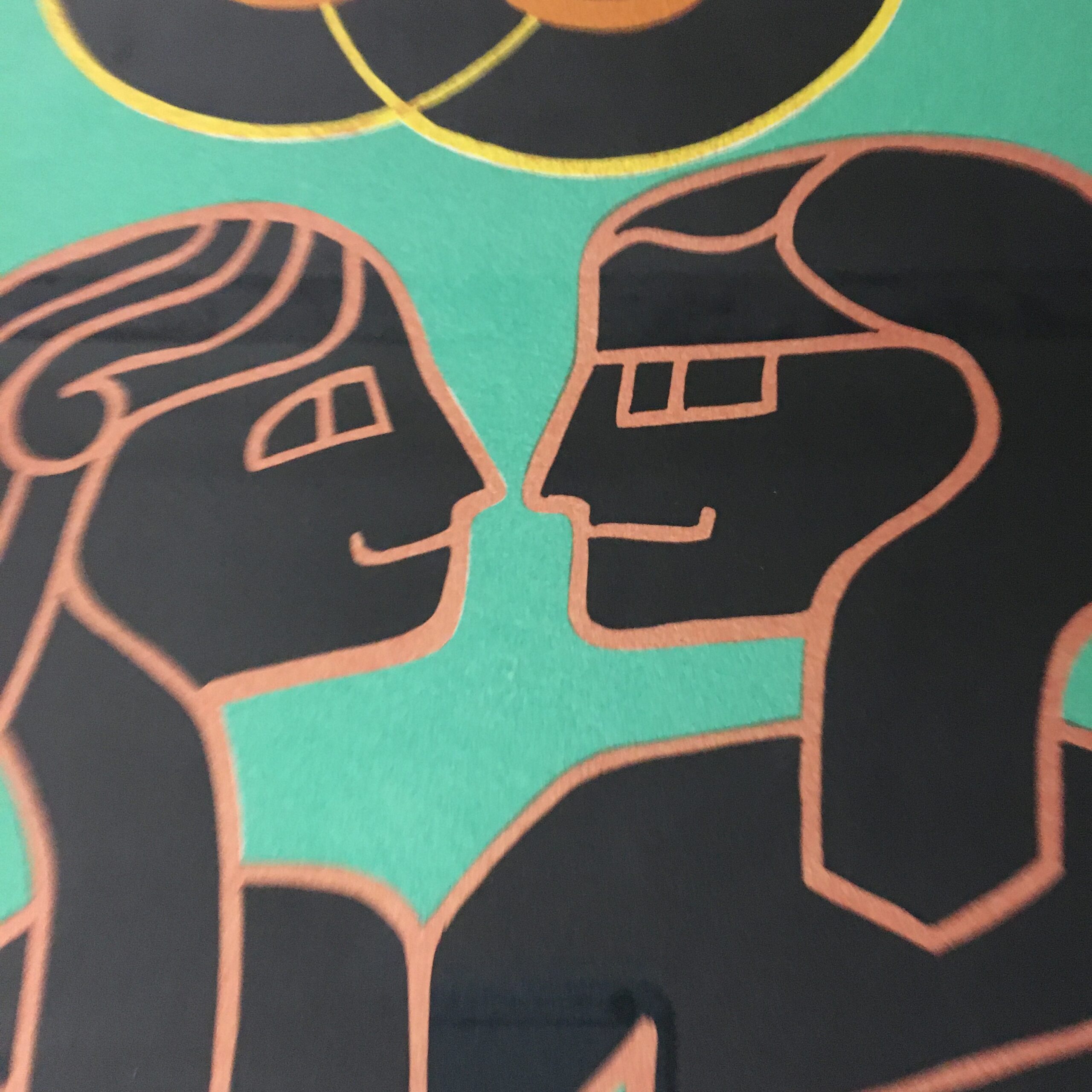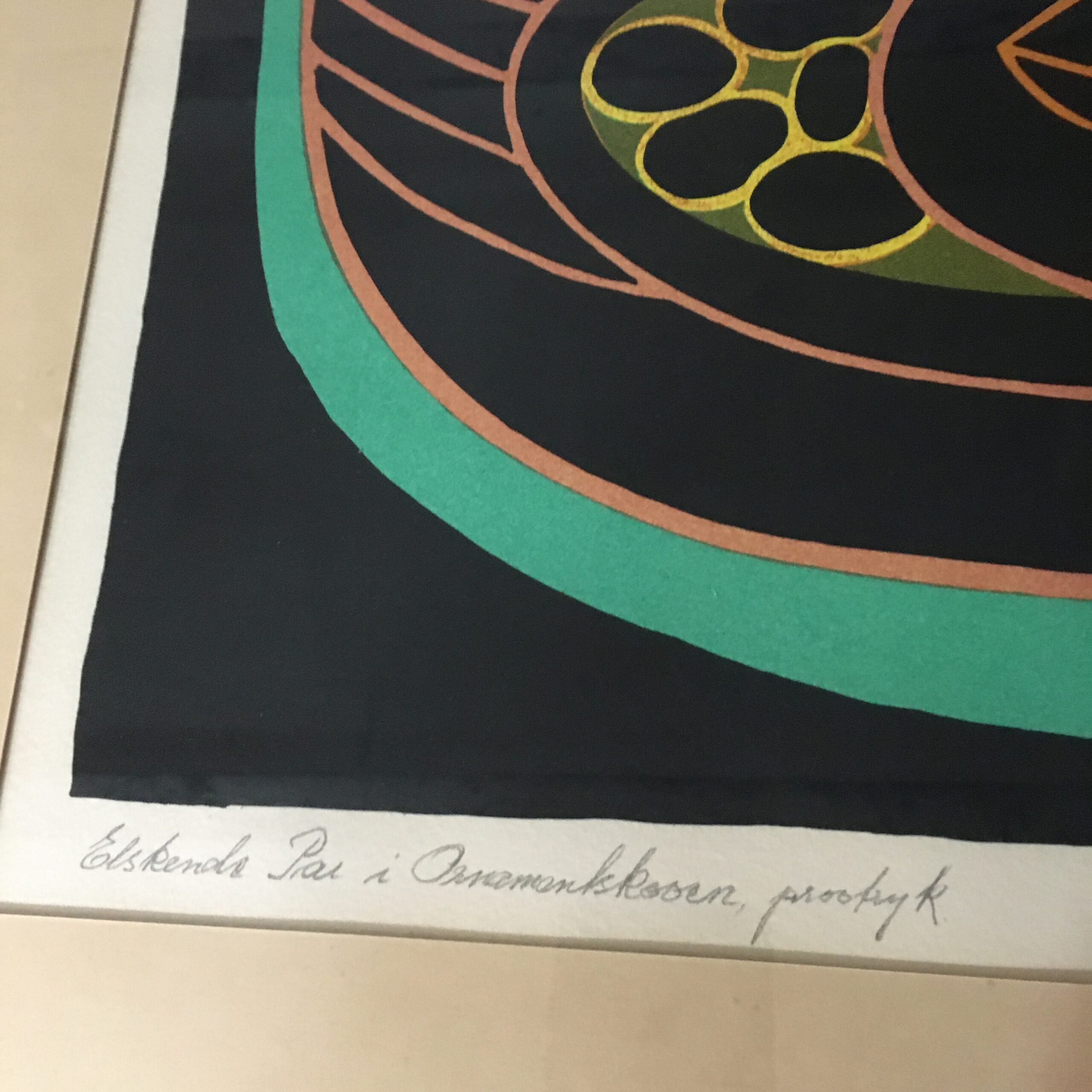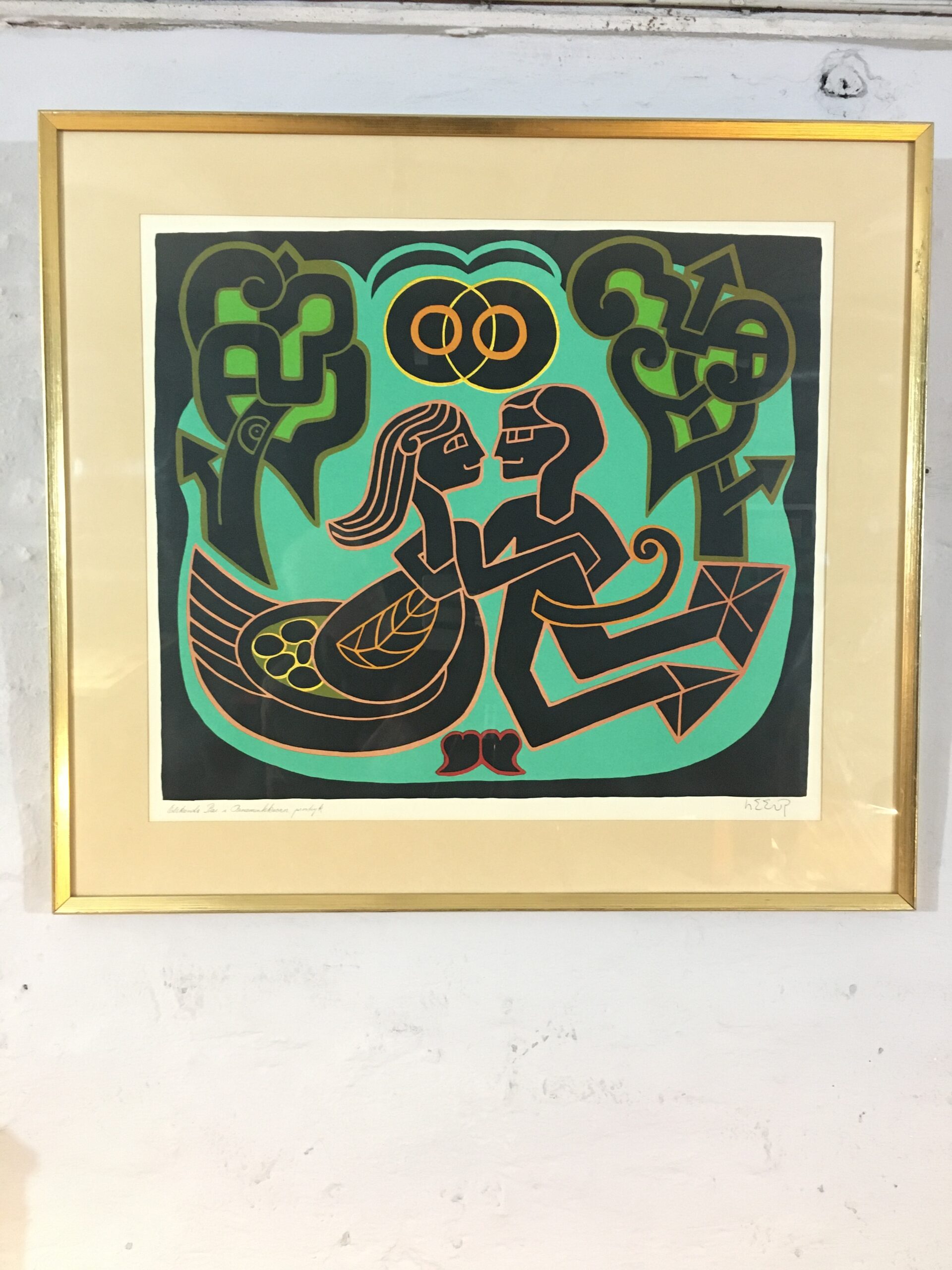 Elskende par i ornamentskoven”. Dette litografiske værk er signeret af Heerup og i farver og formentlig fra 1975. Det er et prøvetryk Lysmål 45 x 51 cm. Rammemål 62 x 68 cm. Og med pas partout og en gylden træramme med patina.