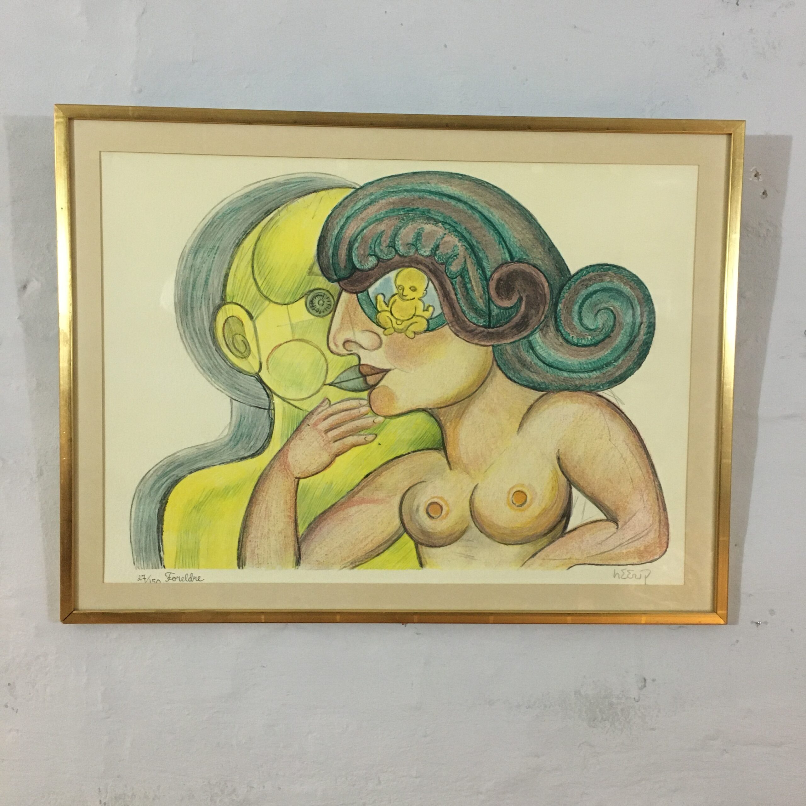”Forældre” er et originalt litografi signeret Heerup og ”Foreldre” og nr. 27 af 150. Lysmål 40 x 55 com. Og rammemål 49 x 65 cm. Det er med passe partout og med en forgyldt træramme. Litografiet er fra 1970 og trykt hos Sandberg og forlaget ”Galerie Böjeson, Malmø”