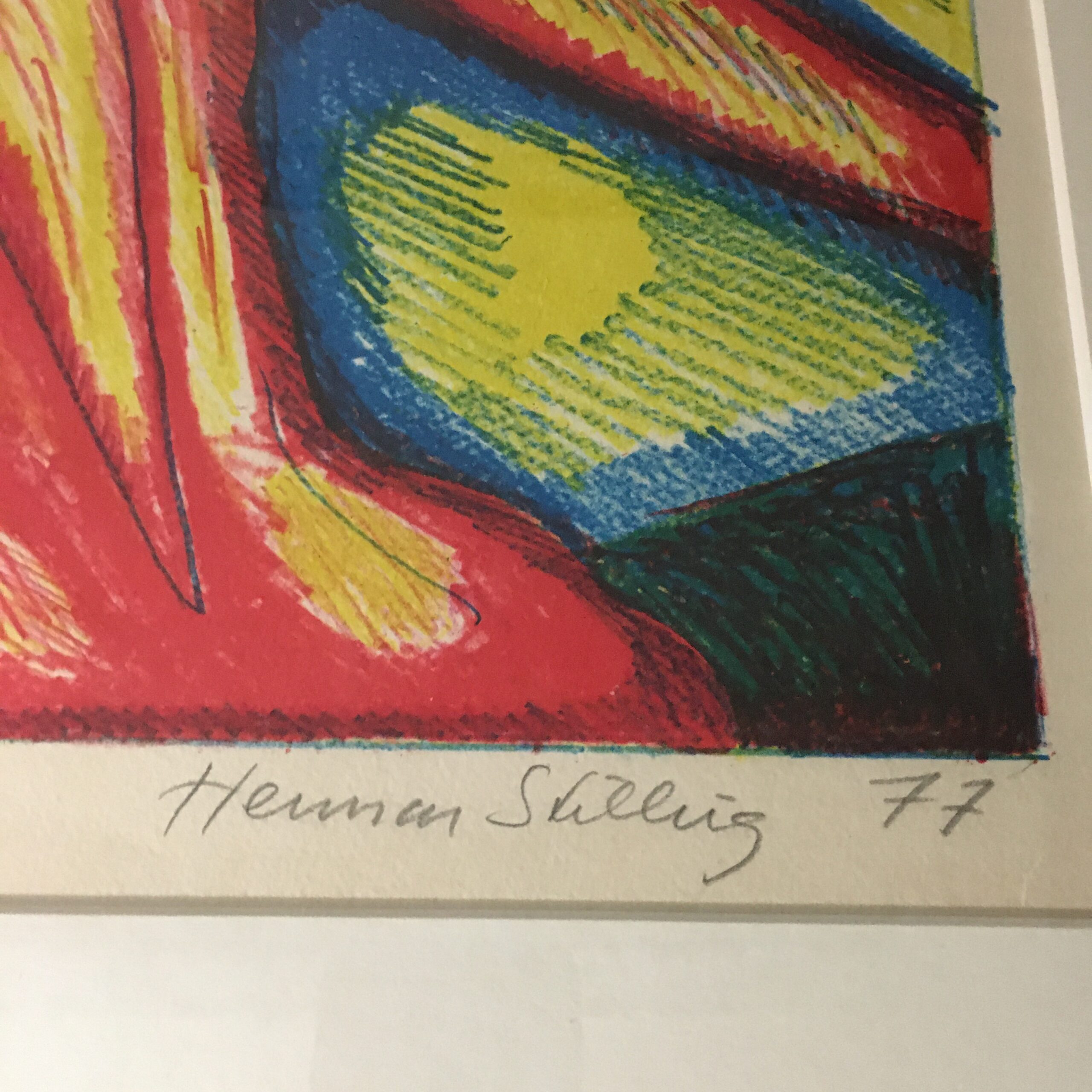 Maler, grafiker og forfatter Herman Stillings originale farve litografi er fra 1977. Stilling er født 1925 i København og død i 1996 i København. Han var uddannet på Kunstakademiet og sol dyr, trolde og sjove væsener blev hans kunstneriske skæbne.