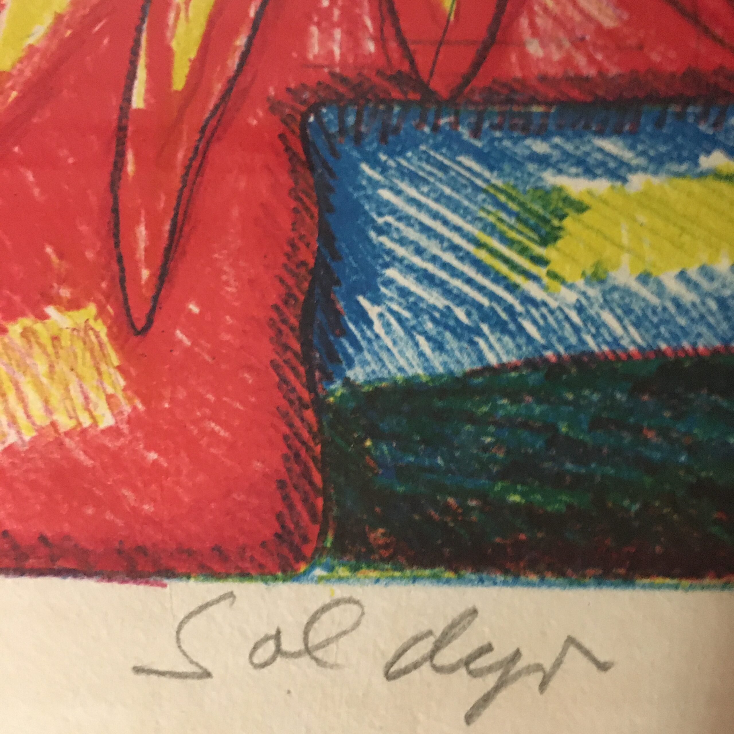 ”Sol dyr” er med ny passe partout og indramning, en rød træramme, der matcher soldyrets stærke udstråling. Værket har ikke været indrammet før og ligget i en skuffe. Det er derfor som nyt fra værkstedet. Lysmål 43 x 51 cm og rammemål 55 x 65 cm. Signeret ”Herman Stilling og nr. 3 af 250 tryk. Trykt hos UM Grafik, København, i dag Edition Copenhagen ( www.editioncopenhagen.com).
