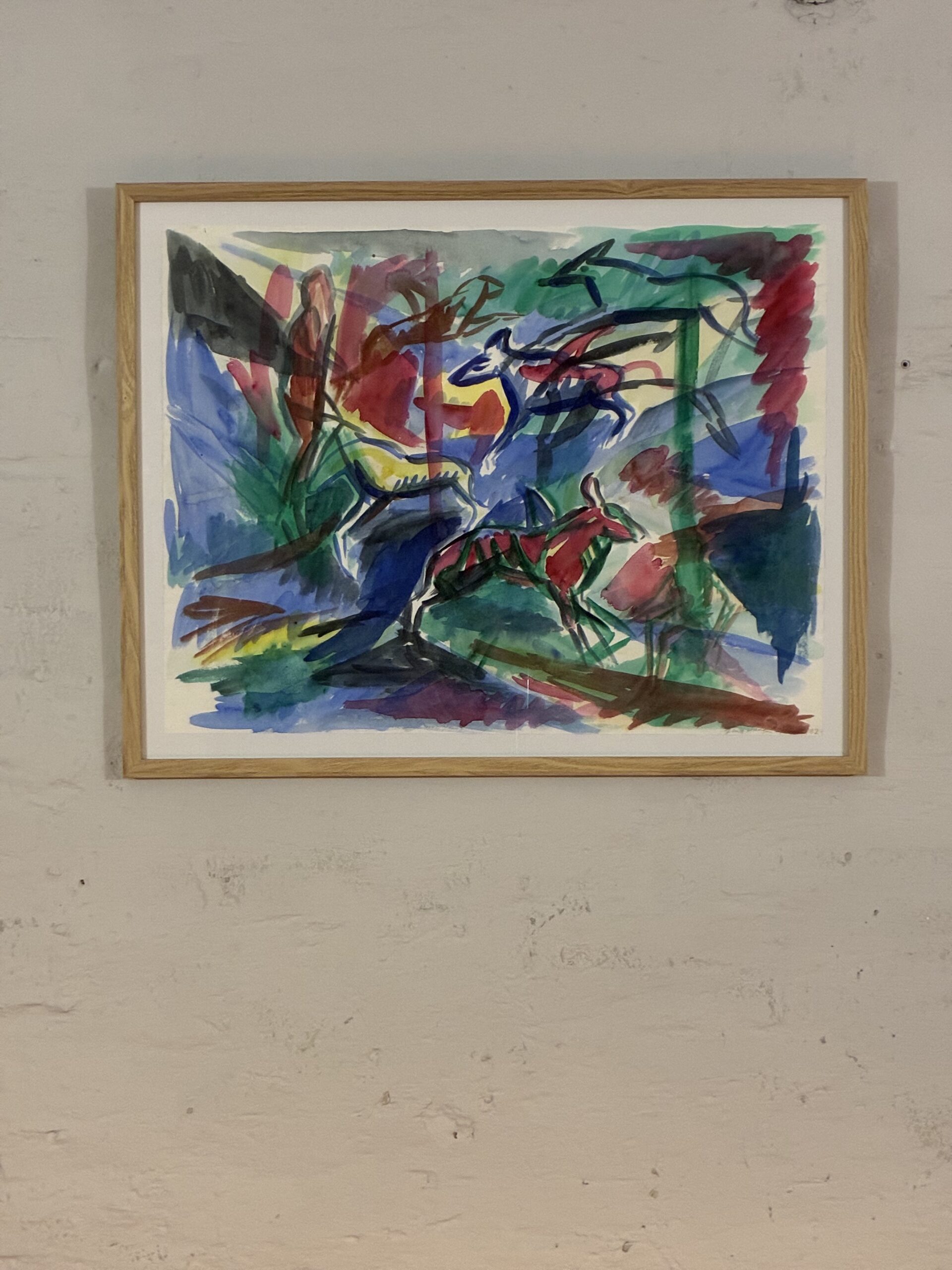 Figurer I landskab på papir (akvarel) er 50 x 65 cm, signeret og fra 1992. Det indrammet med en egeramme (58 x 72 cm).