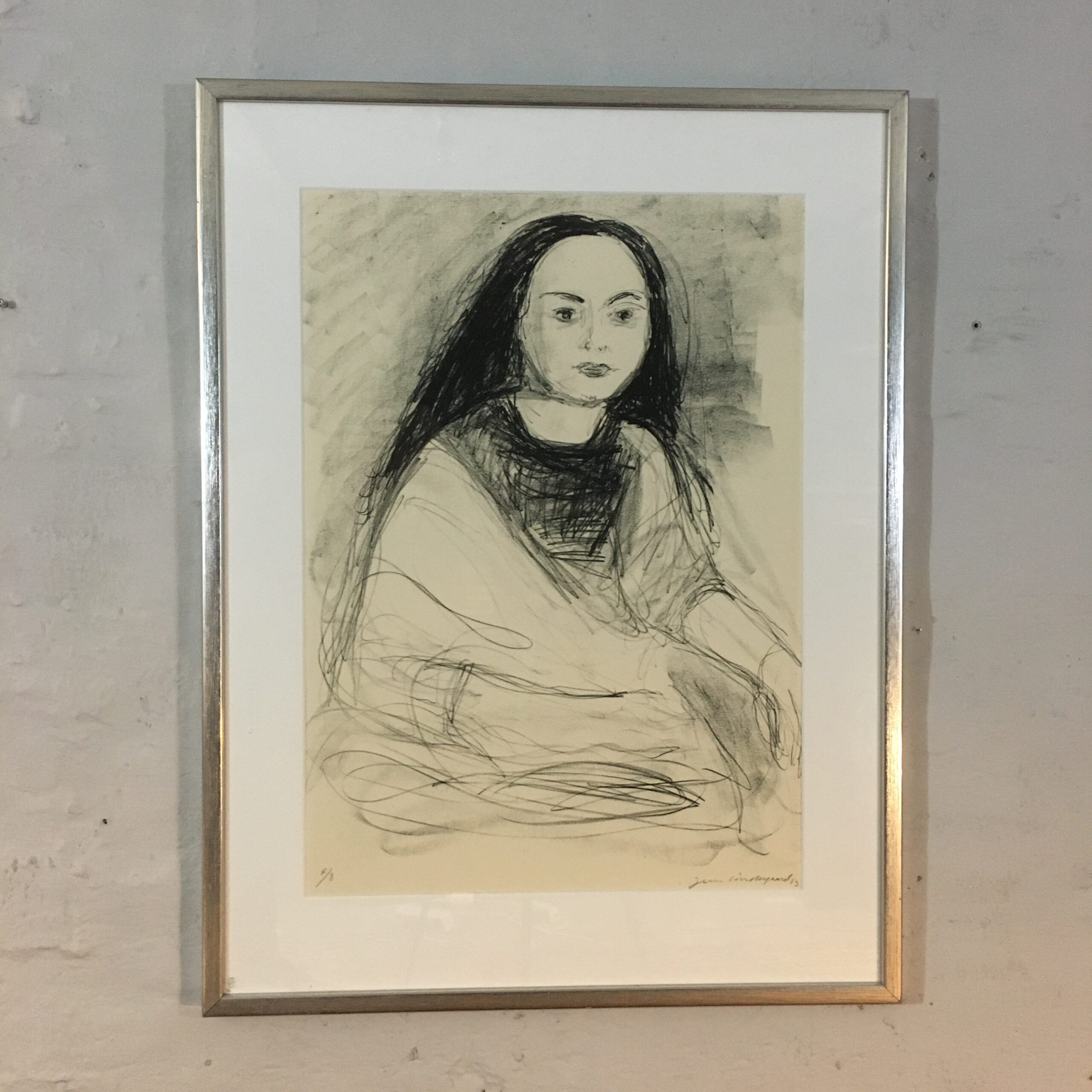 ”Ung kvinde” er et originalt litografi skabt og signeret af jens Søndergaard i 1953. Det er nr. 4 ud af kun 8 ex. og trykt hos I C Sørensen i Hjørring. Lys mål 66 x 48 cm og ramme mål 86 x 69 cm. Det har passepartout og en gedigen sølvmalet træramme.
