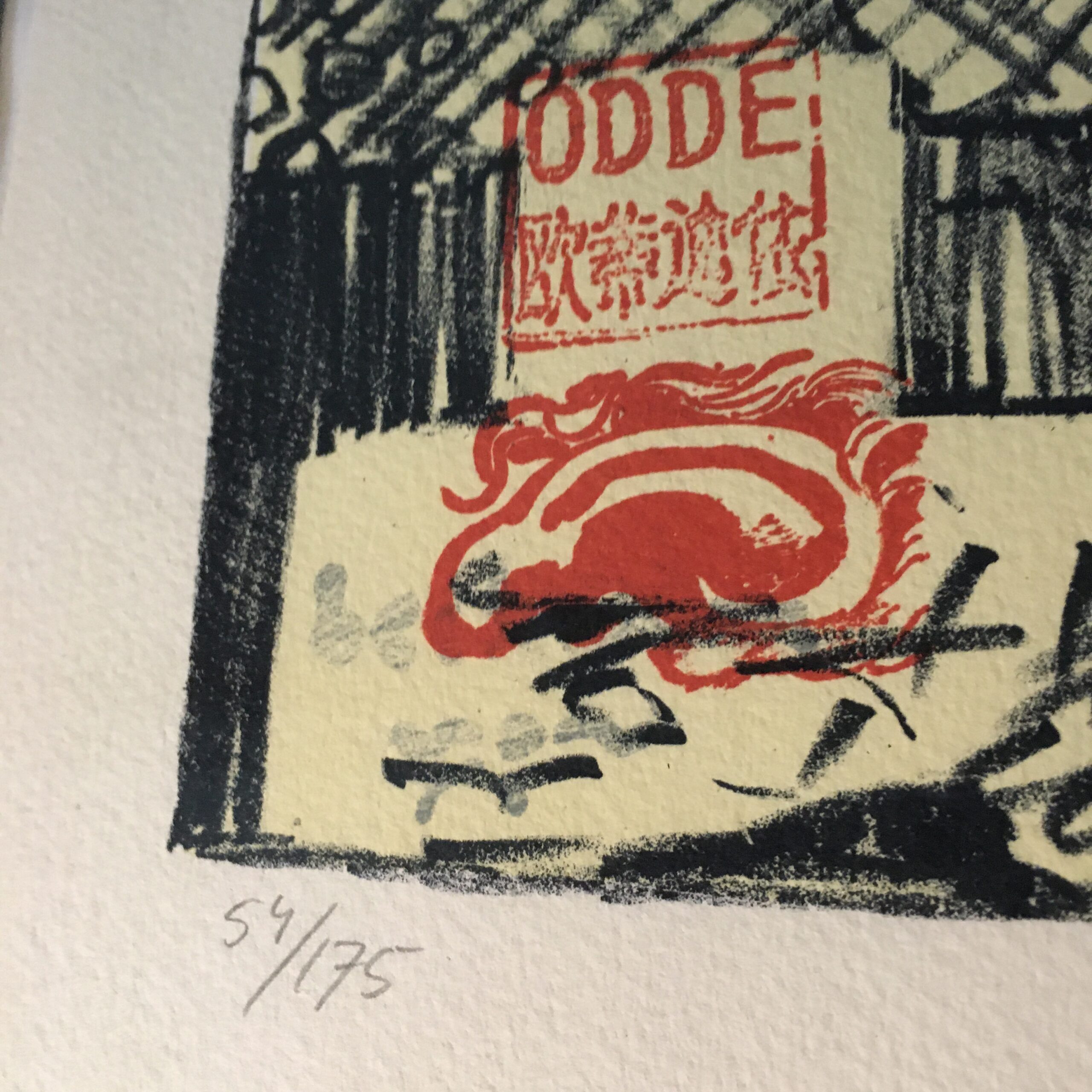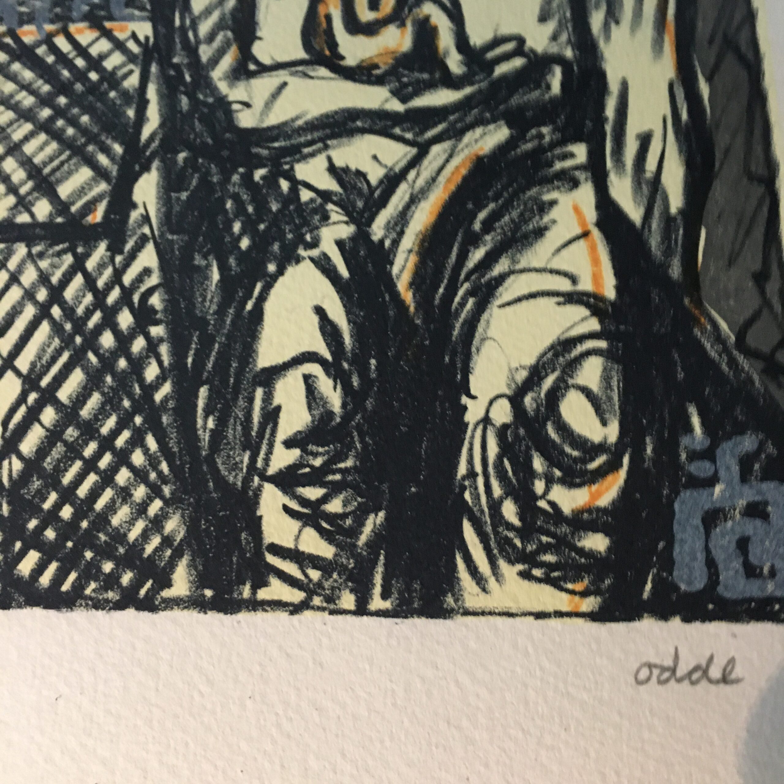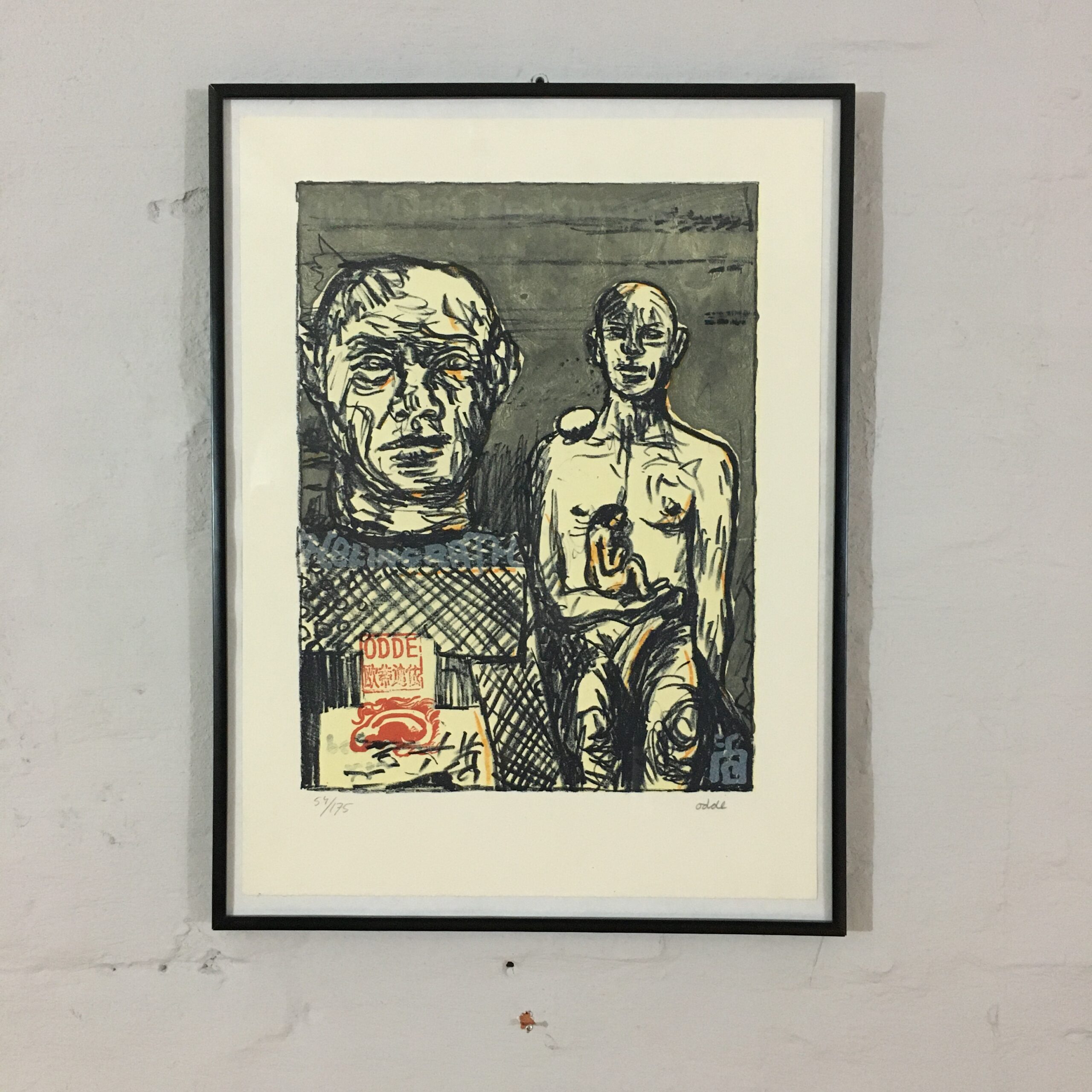 Kvinden ved hjertet er et originalt litografi nr. 54/175, signeret af Odde med blyant. Det er 40 x 30 cm og indrammet med en enkel sort ramme.