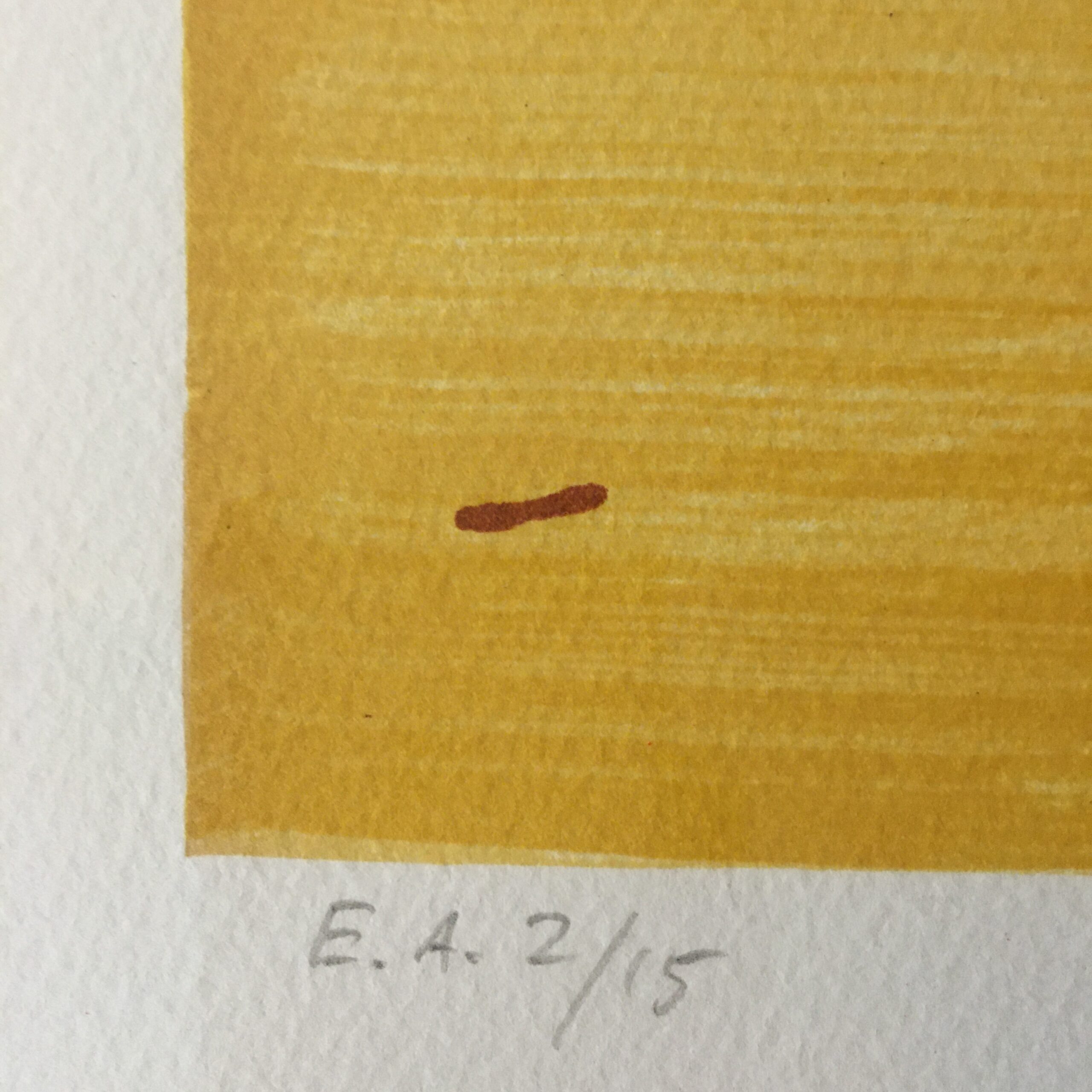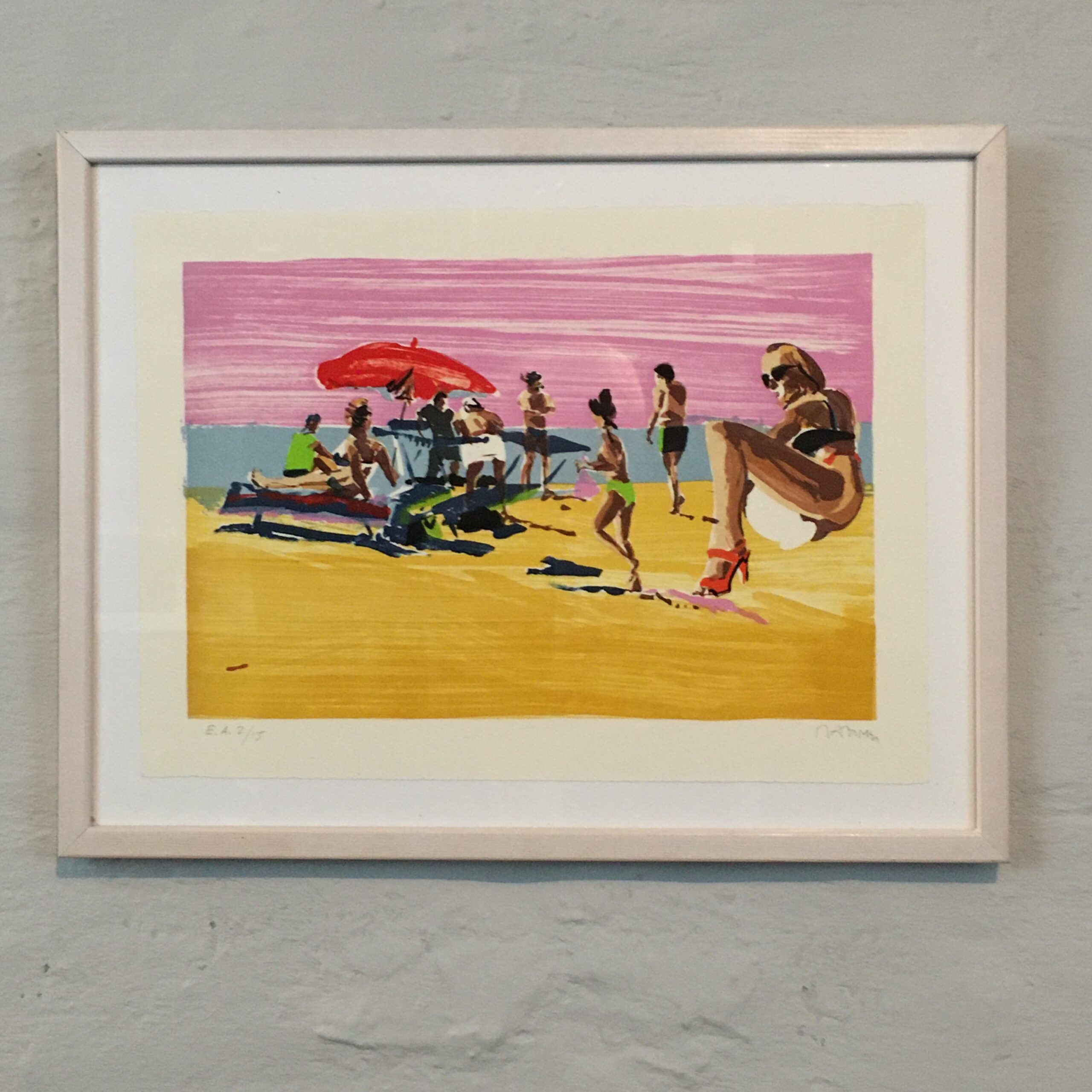 ”Den blodrøde parasol” er signeret af kunstneren og et E.A 2/15 ex. Lysmål 28 x 38 cm og rammemål 35 x 45 cm. Det er i svæveramme og med en hvidmalet træramme.