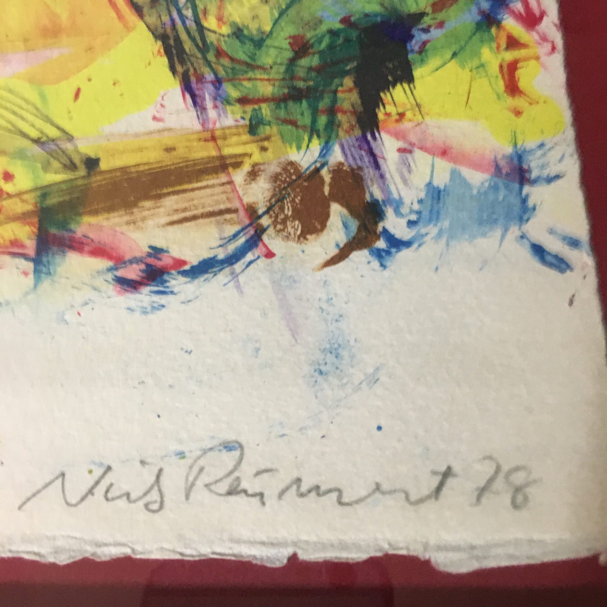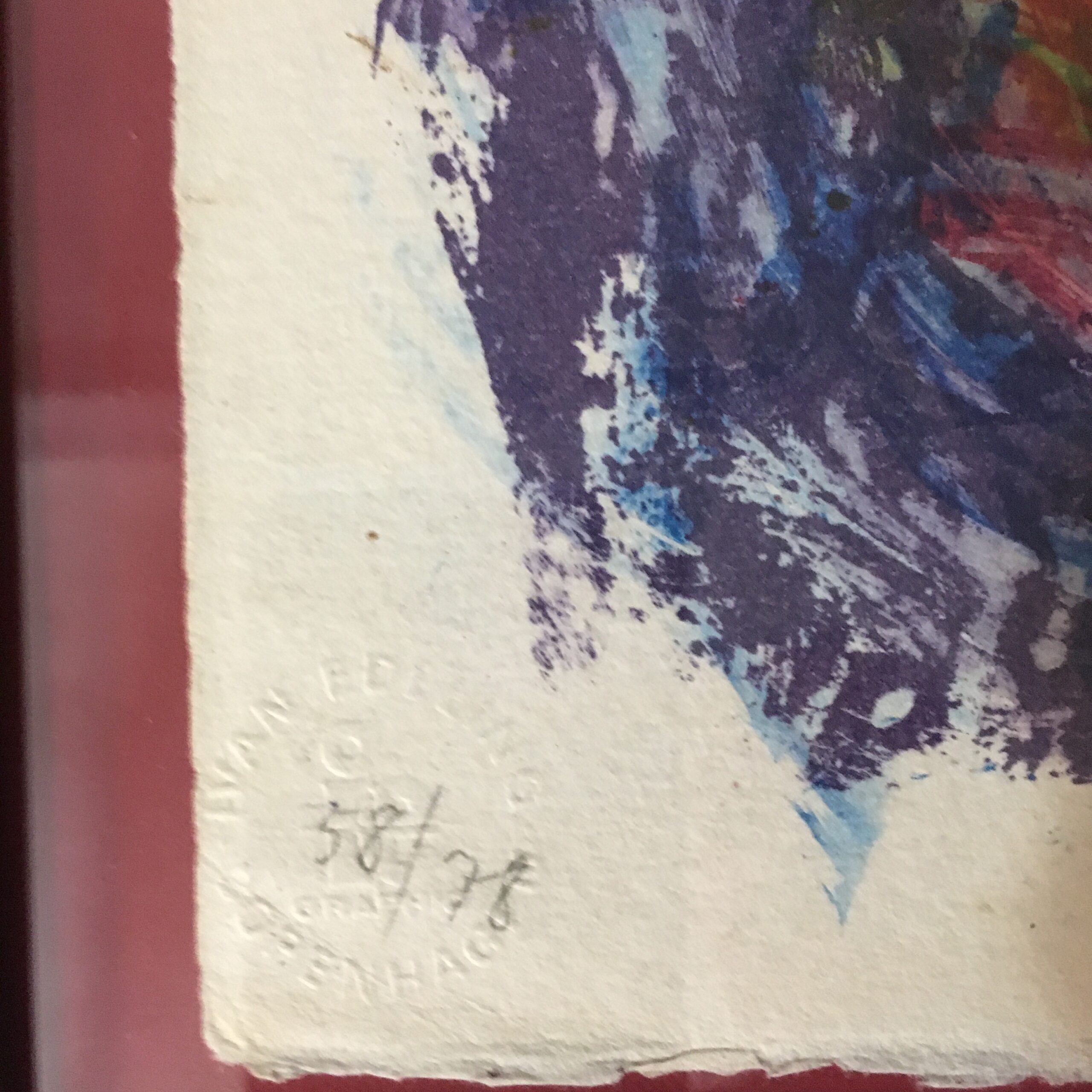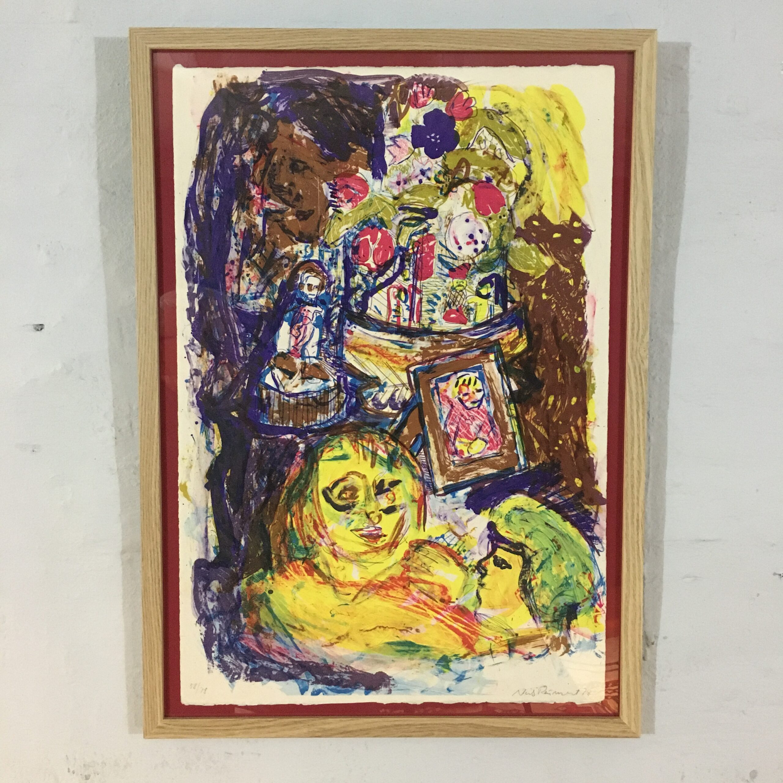”Familieportræt” er et originalt farvelitografi og sjældent set for det er trykt så tidligt som i 1978. Nr. 58/78. Lys mål 38 x 56 cm. Rammemål 44 x 62 cm. Og med en træramme.