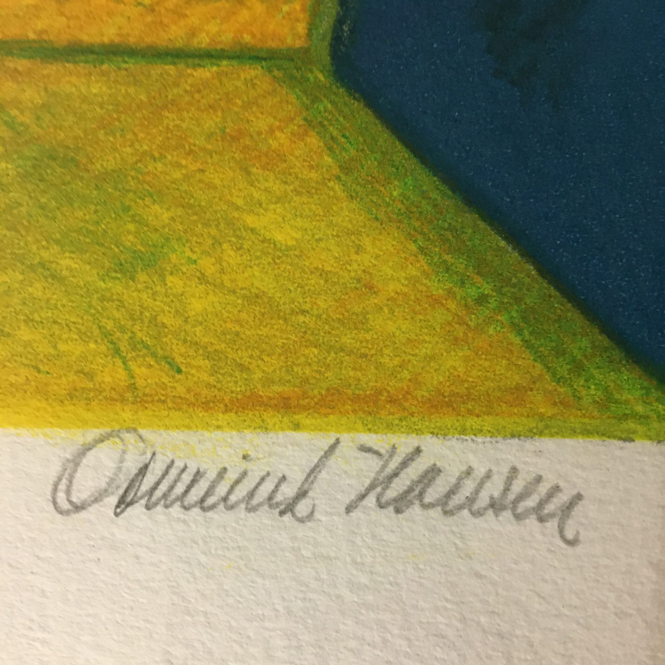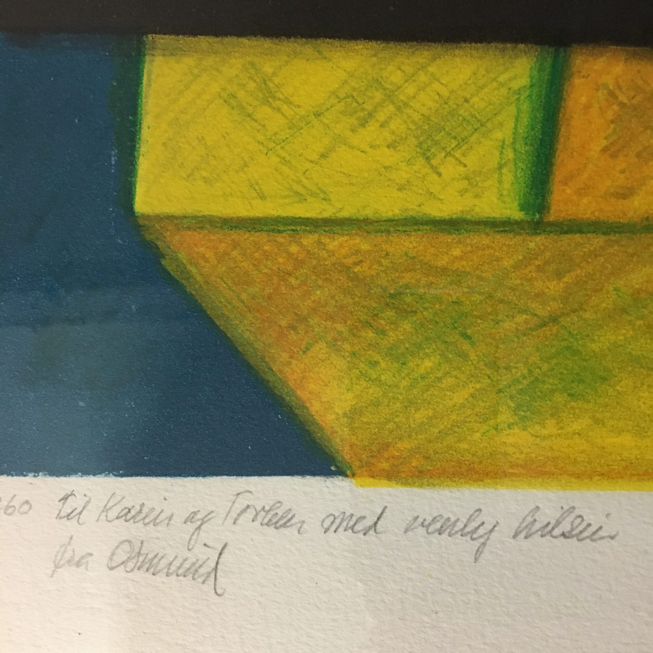 Lyrisk feltarbejde består af 4 originale farvelitografier fra en kunstmappe trykt hos U M Grafik (i dag Edition Copenhagen) på L´Arshes papir. Her ”Den gule” nr. 8/260. med lys mål 56 x 39 cm og rammemål 62 x 44 cm. Med lys træramme. Og med dedikation.