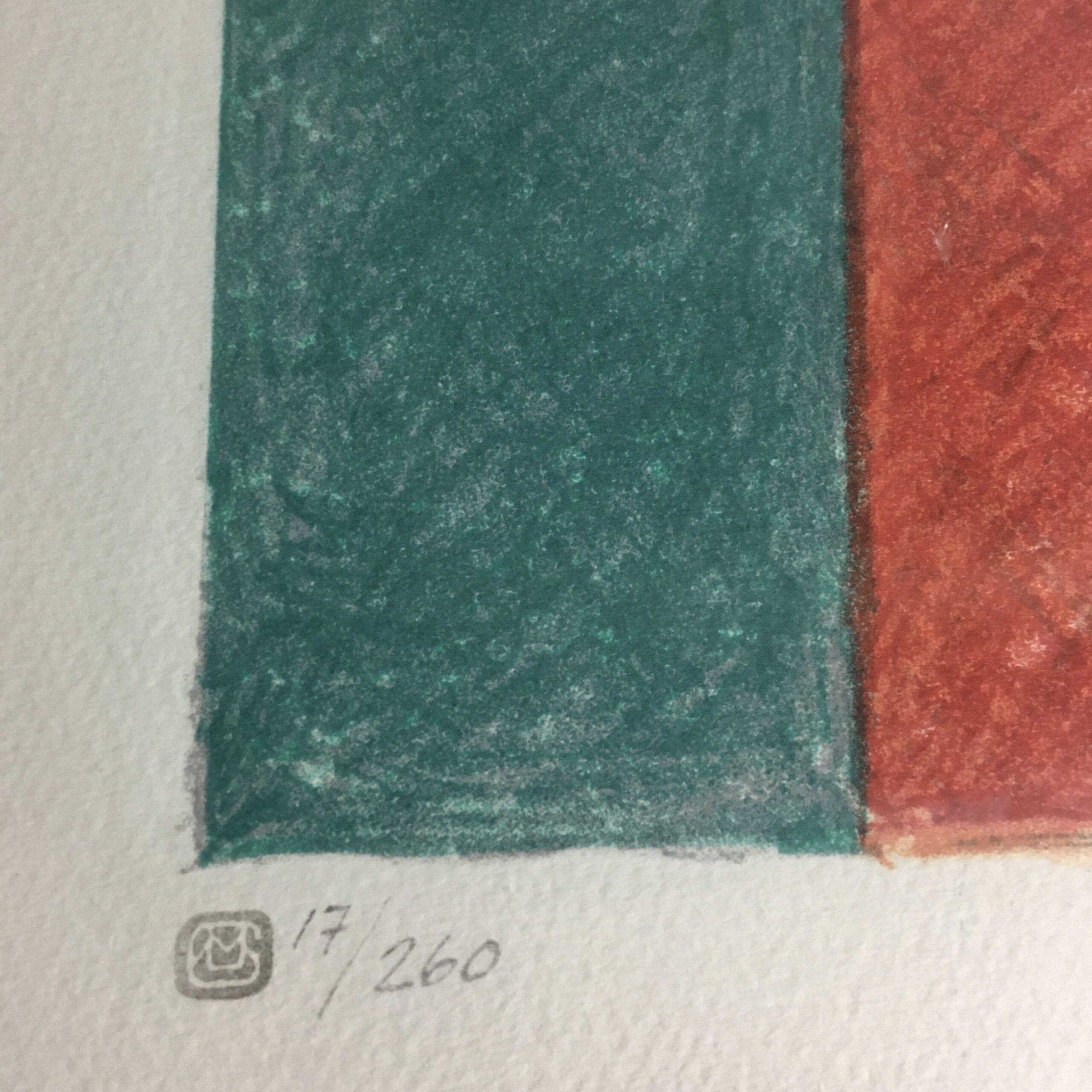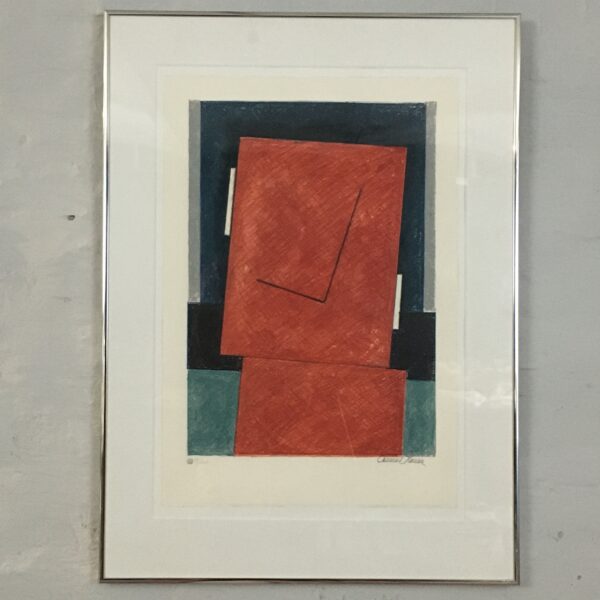 ”Røde firkanter”, originalt litografi, skabt hos U. M. Grafik (i dag Edition Copenhagen) i 1980-erne, signeret Osmund Hansen, nr. 17/260, lysmål 38 x 56 cm og rammemål 54 x 74 cm.