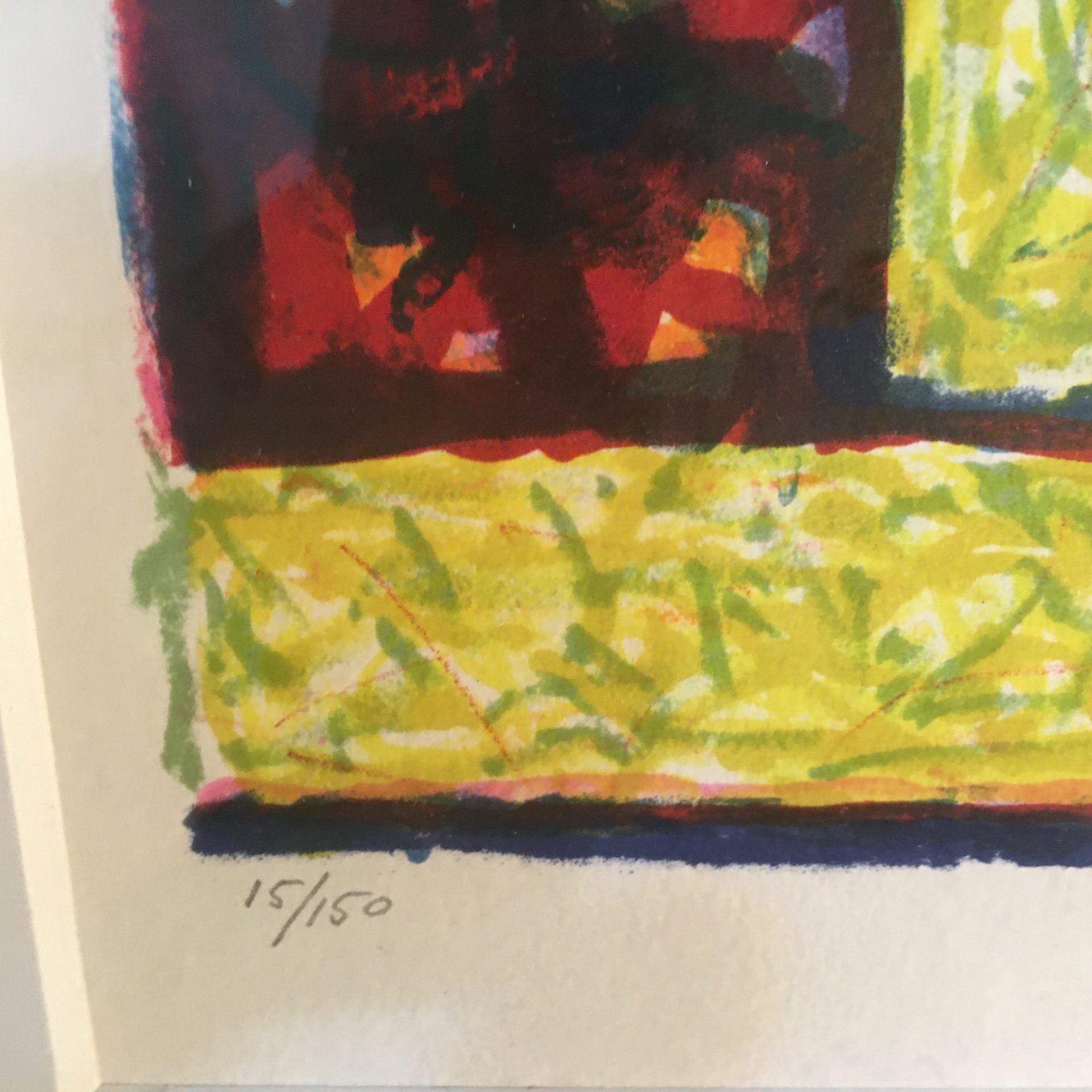 ”Abstrakt, gul, blå, rød”, farvelitografi trykt i 2002. Tryk nr. 15/150. Lysmål 21 x 29 cm. Rammemål 36/43 cm. Signeret Pia Andersen.