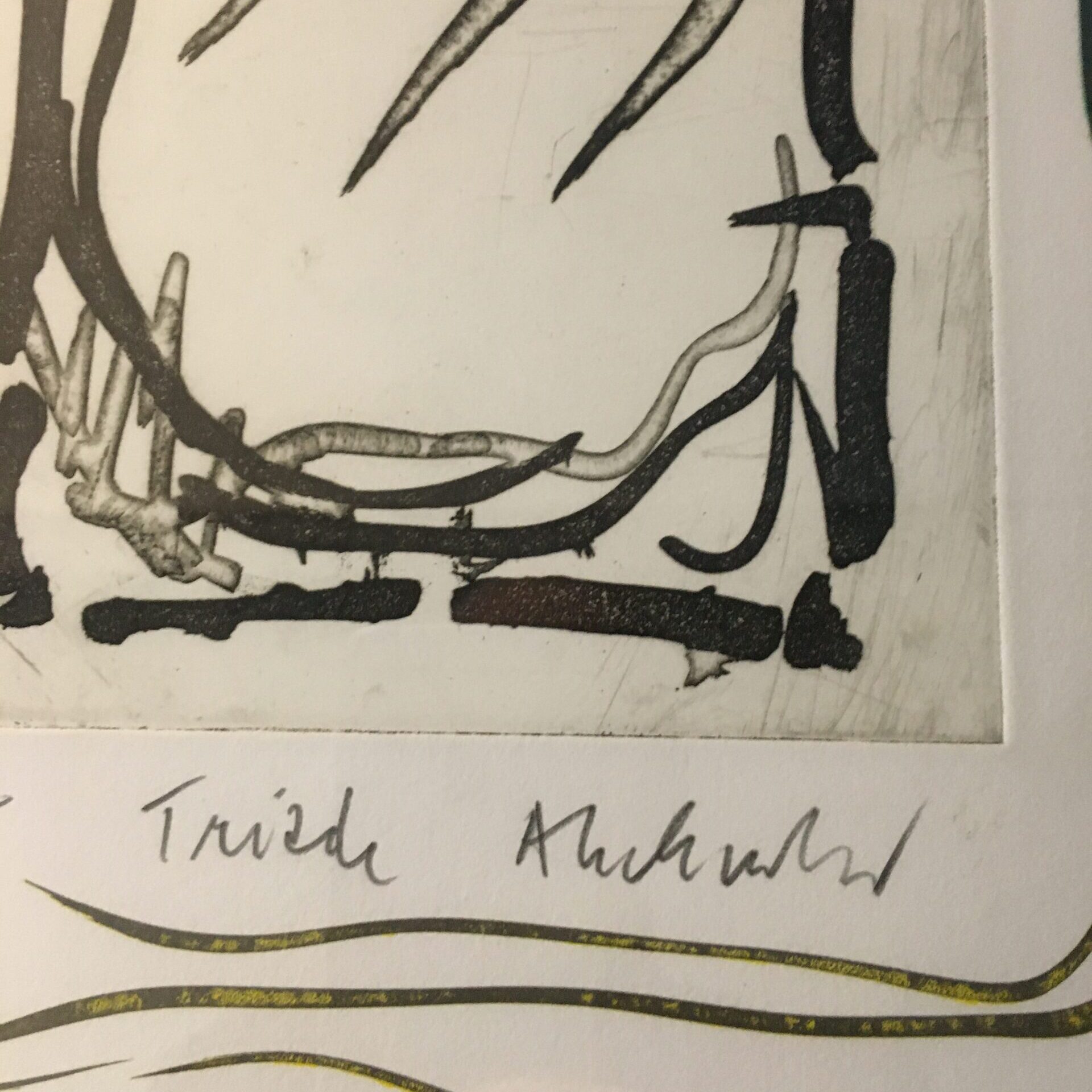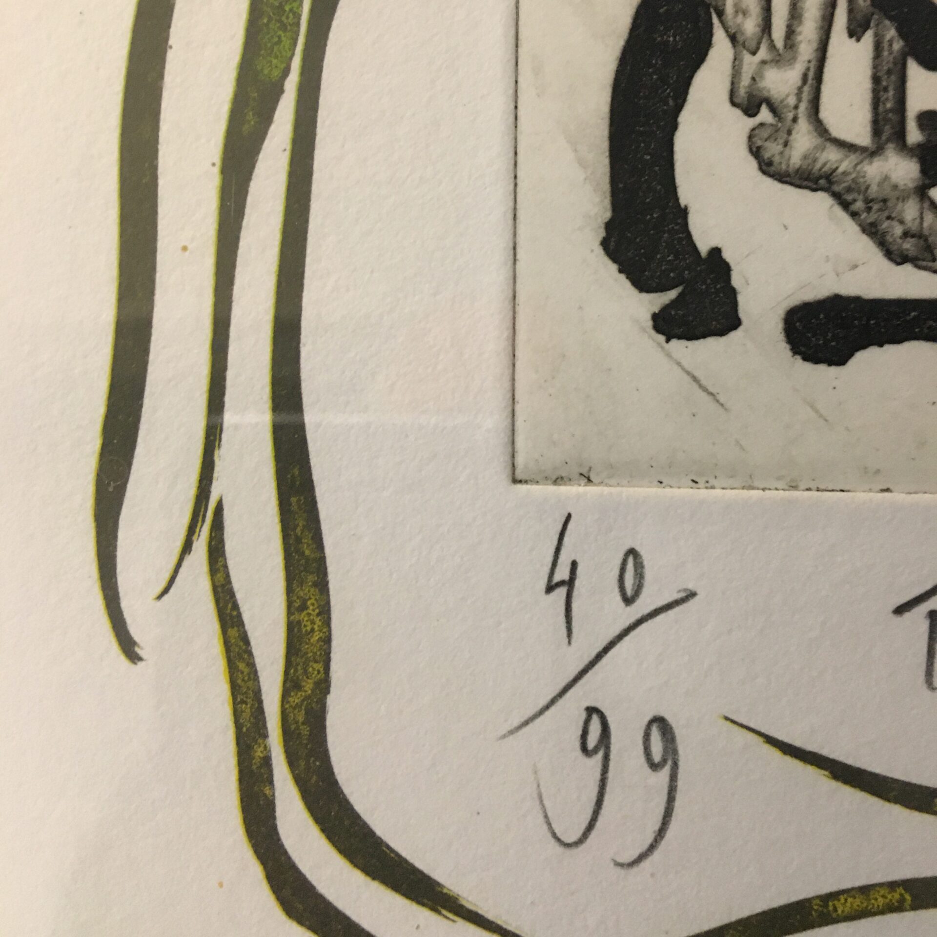 ”Triade” er græsk og et sprogligt virkemiddel, hvor en sætning eller et billede gentages 3 gange. Det styrker budskabet og skaber en rytme i værket. Det er desuden et særligt værk i kraft af, at 2 forskellige trykketeknikker er anvendt. Signet af Alechinsky. Nr. 40 af 99 ex. Lysmål 31 x 23 cm og rammemål 41 x 32 cm. Det indrammet med en ny sort træramme fra www.dinkunst.dk.