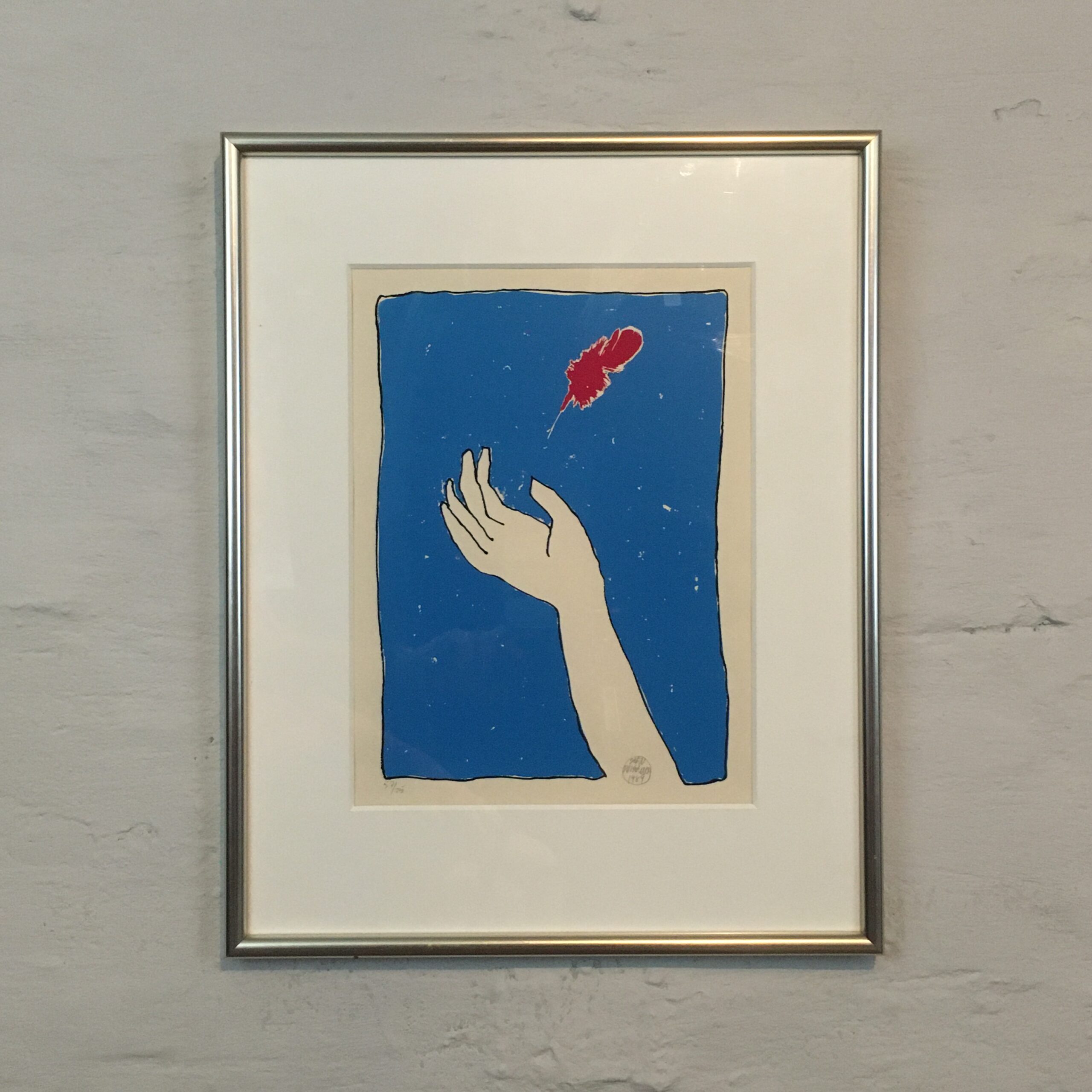”Grib lykken” er et lille, originalt litografi, hvis titel referer til kunstnerens optagethed af menneskets skæbne og identitet. Svend Dalsgårds symbol verden spændte fra håb og tvivl til humor og sarkasme.