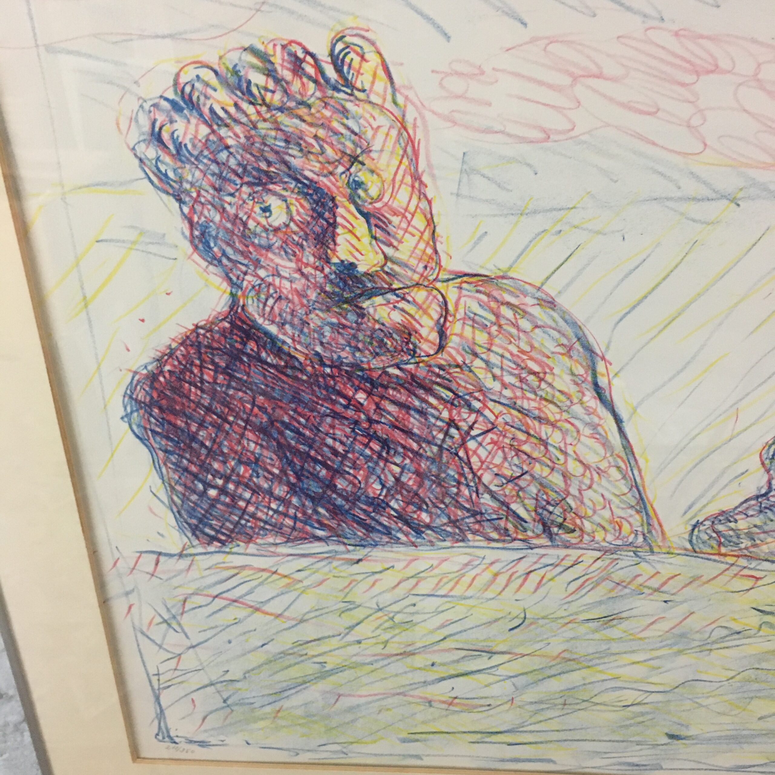”Mennesker ved havet” er et originalt litografi nr. 211/350 dateret 1966 med lys mål 72×43 cm og rammemål 83×60 cm og signeret af kunstneren. Det er med passepartout og aluminiumsramme.