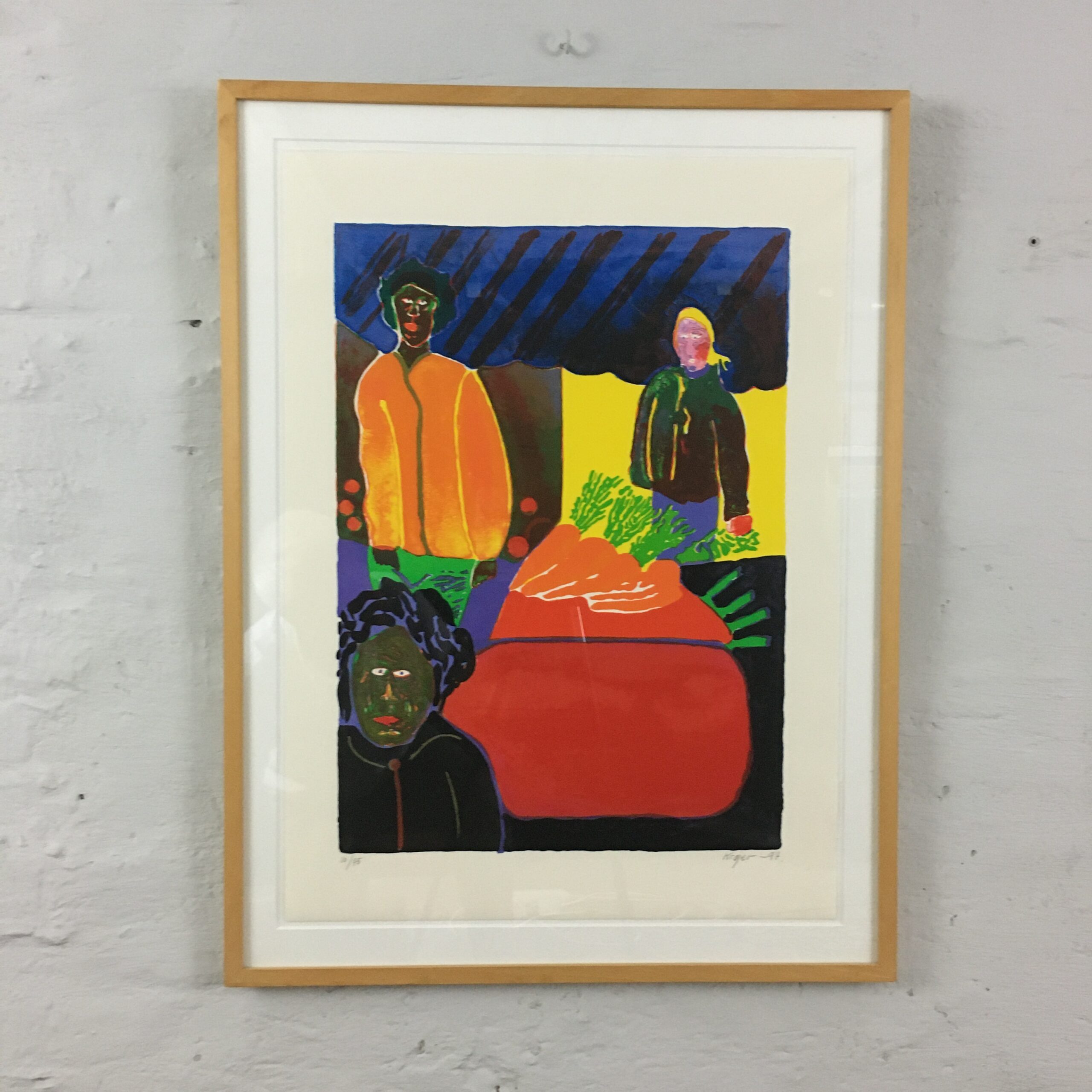 ”Morgen på torvet” er et originallitografi, signeret Krøjer 94 og nr 10/75 tryk. Lysmål 42 x 67 cm og rammemål 57 x 67 cm. Det er med passe partout og en lys træramme.