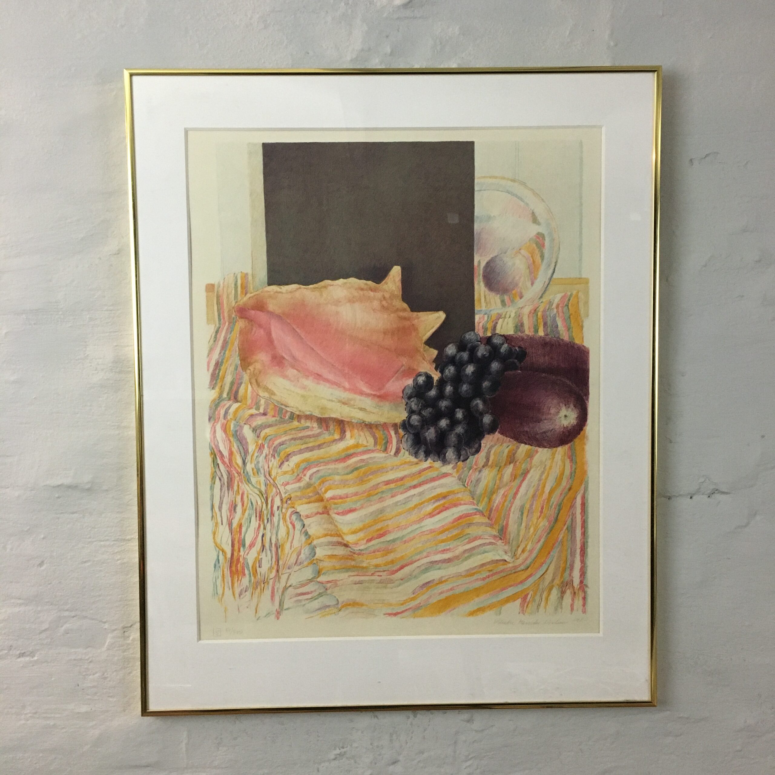 ”Opstilling med vindruer” er et originalt litografi trykt i 1980. Nr. 85 af 300. Lysmål 55 x 45 cm. Og rammemål 70 x 57 cm. Det er indrammet med passe partout og en gylden alu. ramme.
