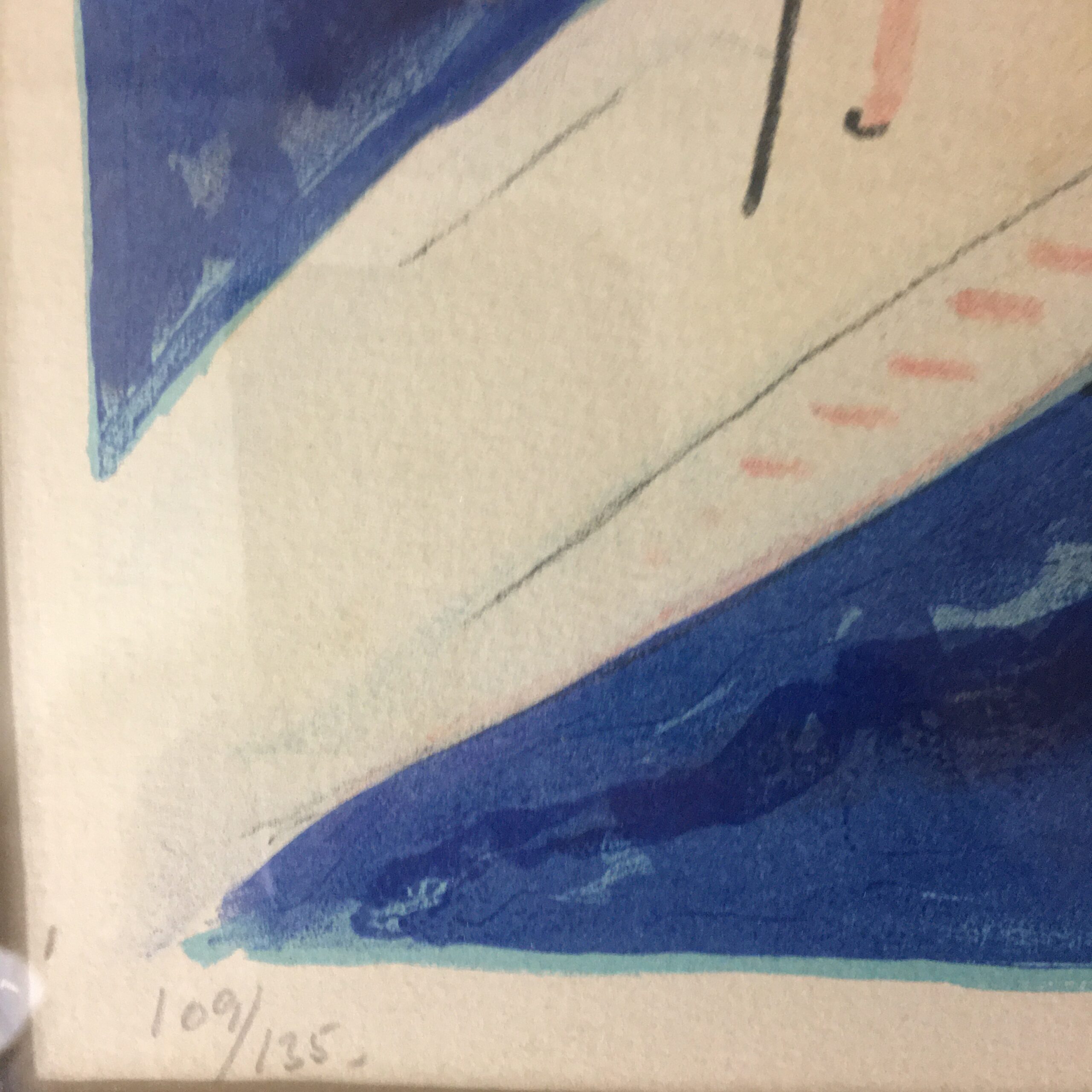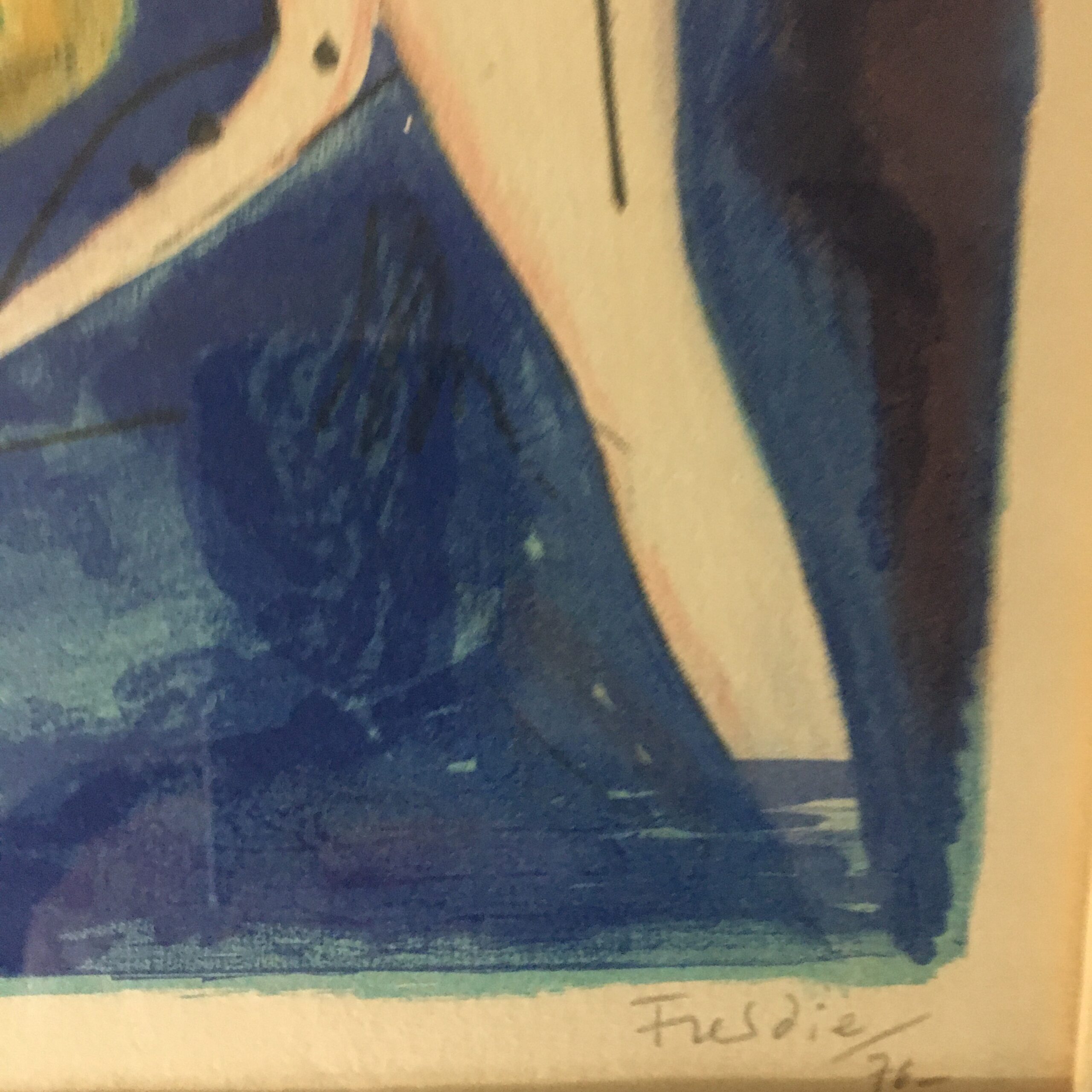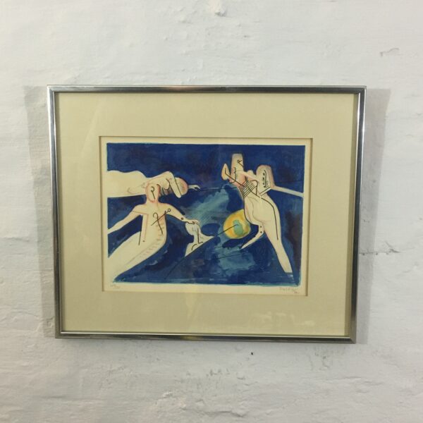 Surrealistisk par er signeret af kunstneren, ”Freddi 76” og et originalt litografi nr. 109 af 139. Lysmål 40 x 30 cm og rammemål 58 x 48 cm. Det er med passe partout og en sølvfarvet træramme.